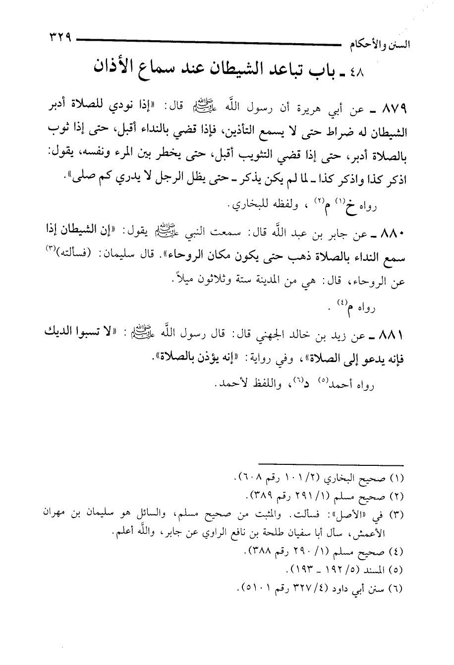 880 - عن جابر بن عبد الله قال: سمعت النبي - صلى الله عليه وسلم - يقول: "إن الشيطان إذا سمع النداء بالصلاة ذهب حتى يكون مكان الروحاء". قال سليمان: (فسألته) (¬3) عن الروحاء، قال: هي من المدينة ستة وثلاثون ميلاً.