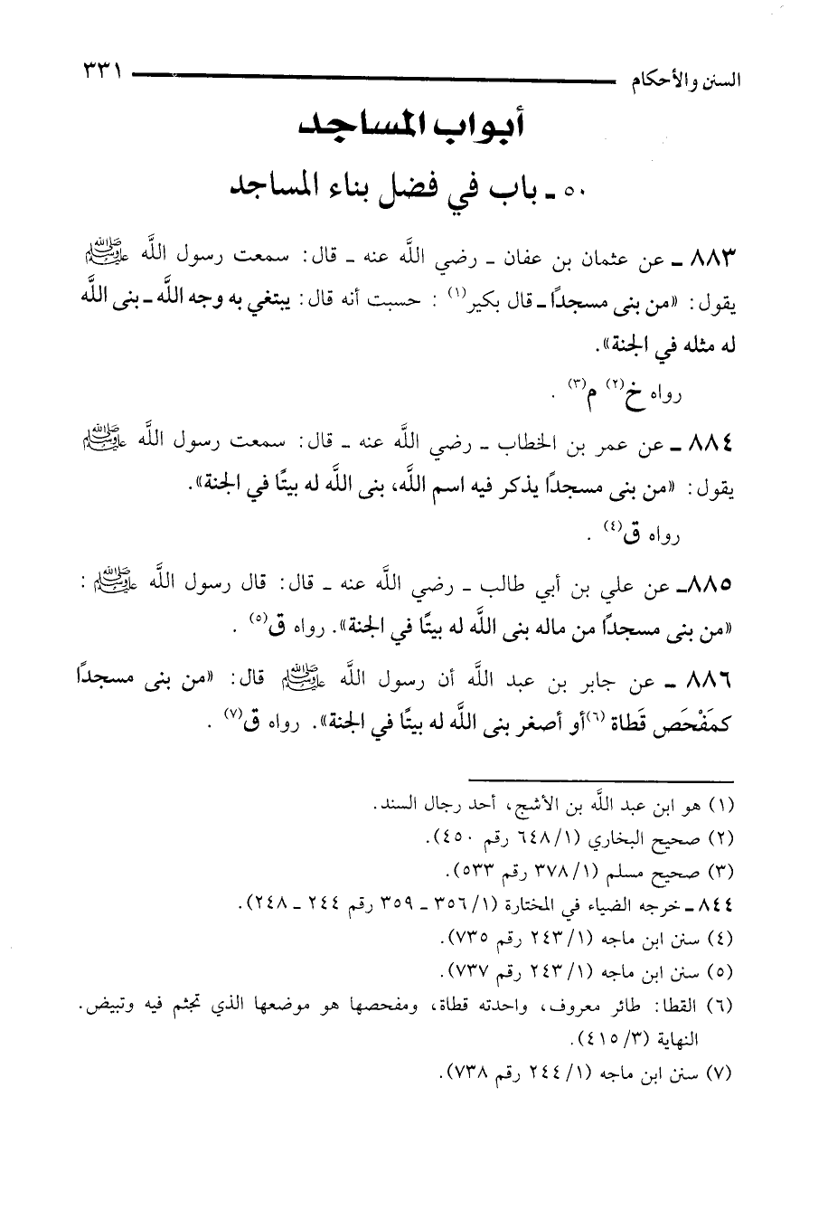 886 - عن جابر بن عبد الله أن رسول الله - صلى الله عليه وسلم - قال: "من بنى مسجدًا كمَفْحَص قَطاة (¬6) أو أصغر بنى الله له بيتًا في الجنة". رواه ق (¬7).