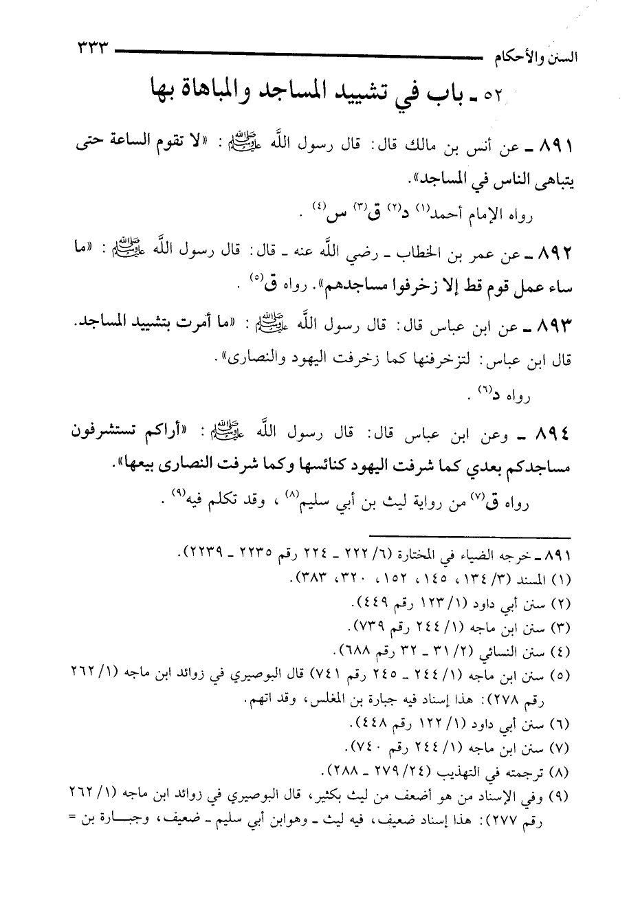 893 - عن ابن عباس قال: قال رسول الله - صلى الله عليه وسلم -: "ما أمرت بتشييد المساجد. قال ابن عباس: لتزخرفنها كما زخرفت اليهود والنصارى".