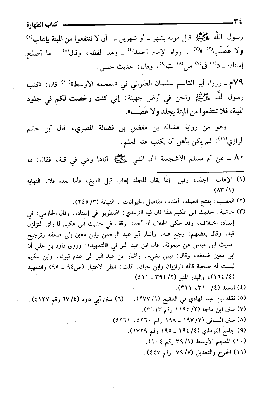 79م- ورواه أبو القاسم سليمان الطبراني في "معجمه الأوسط" (¬10) قال: "كتب رسول الله - صلى الله عليه وسلم - ونحن في أرض جهينة: إني كنت رخصت لكم في جلود الميتة، فلا تنتفعوا من الميتة بجلد ولا عَصَب".