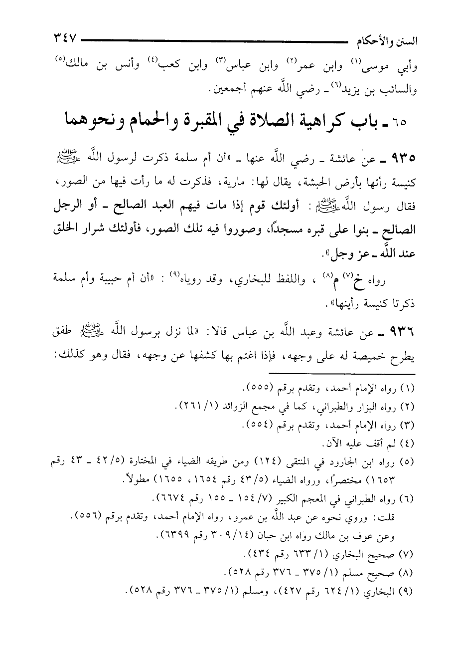 935 - عن عائشة -رضي الله عنها- "أن أم سلمة ذكرت لرسول الله - صلى الله عليه وسلم - كنيسة رأتها بأرض الحبشة، يقال لها: مارية، فذكرت له ما رأت فيها من الصور، فقال رسول الله - صلى الله عليه وسلم -: أولئك قوم إذا مات فيهم العبد الصالح -أو الرجل الصالح- بنوا على قبره مسجدًا، وصوروا فيه تلك الصور، فأولئك شرار الخلق عند الله -عز وجل".