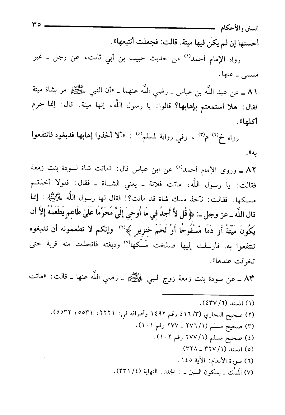 82 - وروى الإمام أحمد (¬5) عن ابن عباس قال: "ماتت شاة لسودة بنت زمعة فقالت: يا رسول الله، ماتت فلانة -يعني الشاة- فقال: فلولا أخذتم مسكها. فقالت: نأخذ مسك شاة قد ماتت؟! فقال لها رسول الله - صلى الله عليه وسلم -: إنما قال الله -عز وجل-: (قُل لاَ أَجِدُ فِي مَا أُوحِيَ إِلَيَّ مُحَرَّمًا عَلَى طَاعِمٍ يَطْعَمُهُ إِلاَّ أَن يَكُونَ مَيْتَةً أَوْ دَمًا مَّسْفُوحًا أَوْ لَحْمَ خِنزِيرٍ) (¬6) وإنكم لا تطعمونه أن تدبغوه تنتفعوا به. فأرسلت إليها فسلخت مَسْكها (¬7) ودبغته فاتخذت منه قربة حتى تخرقت عندها".