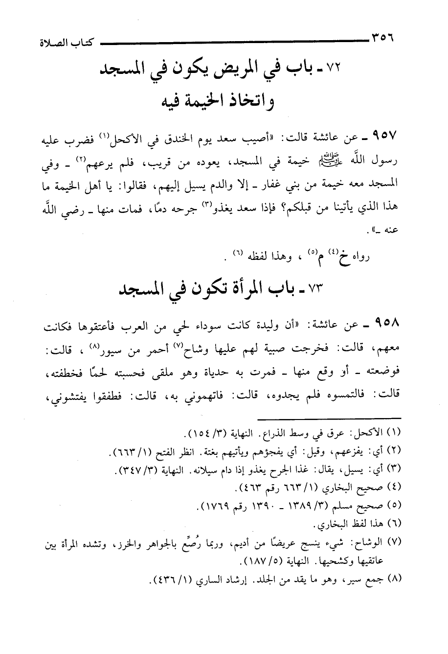 957 - عن عائشة قالت: "أصيب سعد يوم الخندق في الأكحل (¬1) فضرب عليه رسول الله - صلى الله عليه وسلم - خيمة في المسجد، يعوده من قريب، فلم يرعهم (¬2) -وفي المسجد معه خيمة من بني غفار- إلا والدم يسيل إليهم، فقالوا: يا أهل الخيمة ما هذا الذي يأتينا من قبلكم؟ فإذا سعد يغذو (¬3) جرحه دمًا، فمات منها -رضي الله عنه-".