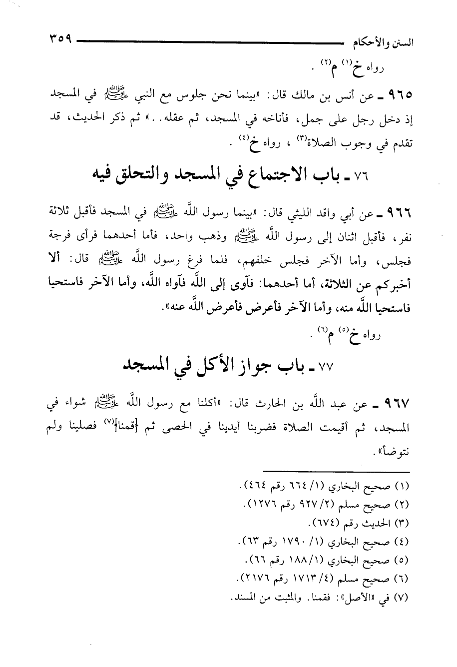 965 - عن أنس بن مالك قال: "بينما نحن جلوس مع النبي - صلى الله عليه وسلم - في المسجد إذ دخل رجل على جمل، فأناخه في المسجد، ثم عقله .. " ثم ذكر الحديث، قد تقدم في وجوب الصلاة (¬3)، رواه خ (¬4).