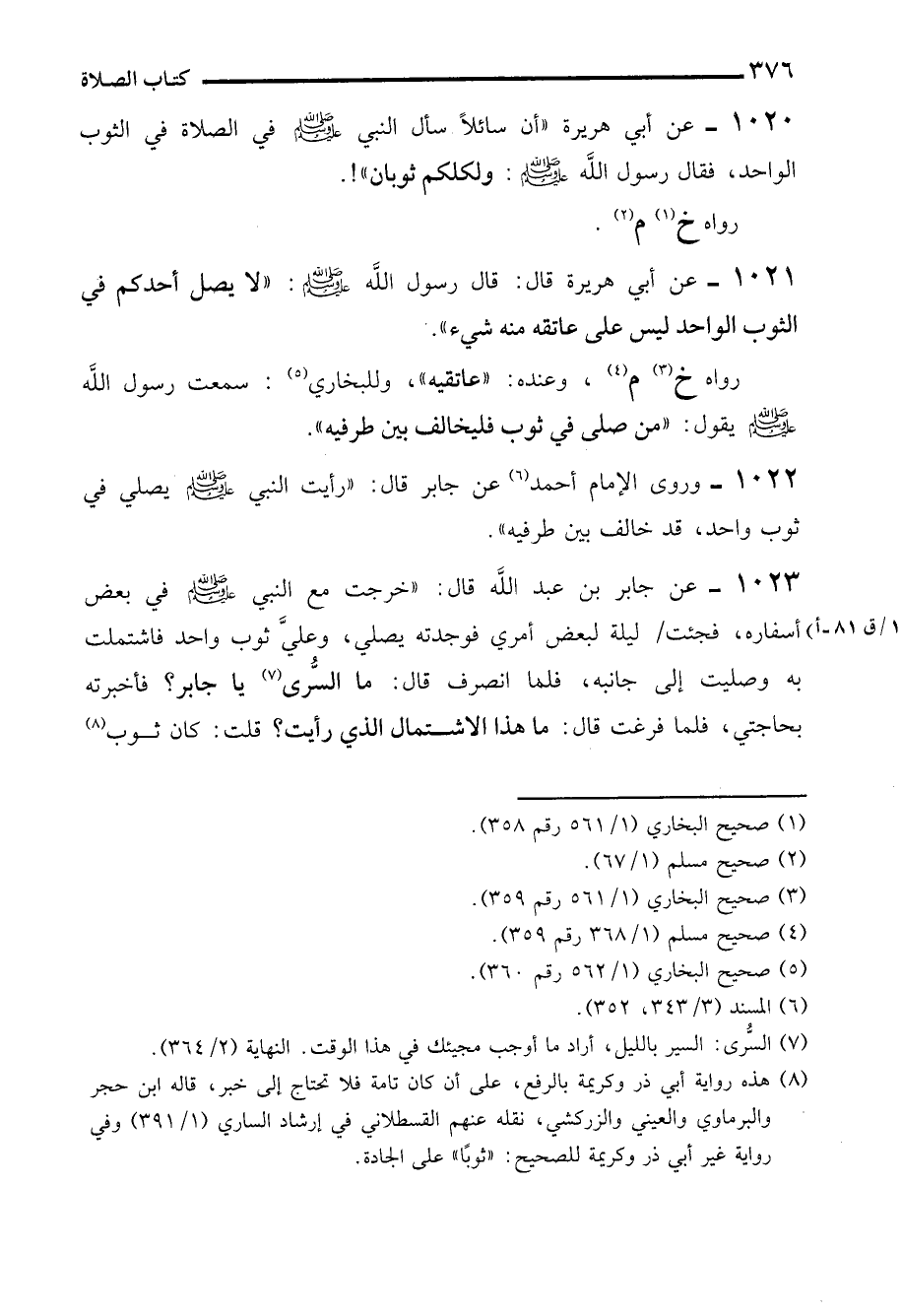 1022 - وروى الإمام أحمد (¬6) عن جابر قال: "رأيت النبي - صلى الله عليه وسلم - يصلي في ثوب واحد، قد خالف بين طرفيه".