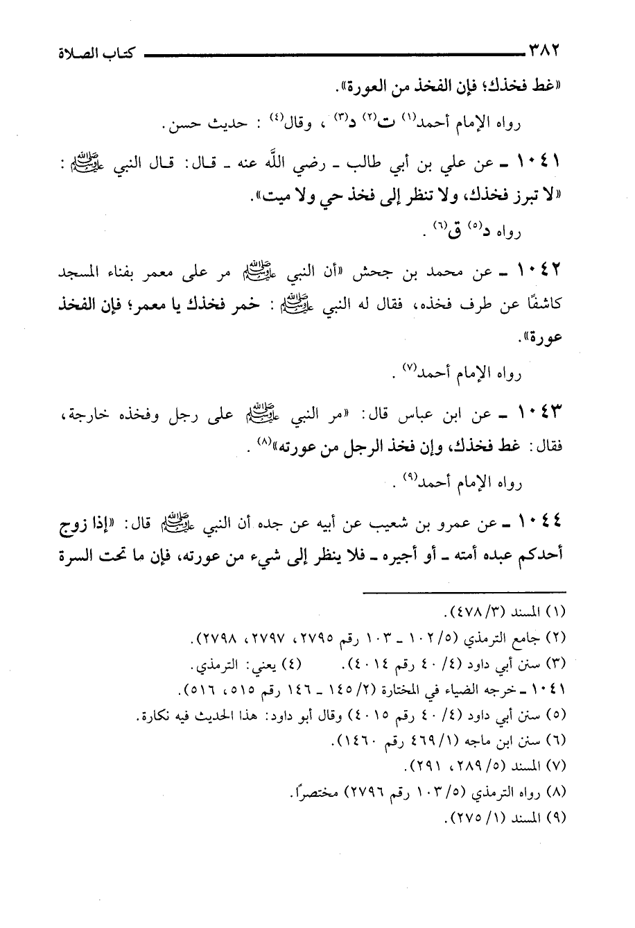 1043 - عن ابن عباس قال: "مر النبي - صلى الله عليه وسلم - على رجل وفخذه خارجة، فقال: غط فخذك، وإن فخذ الرجل من عورته" (¬8).