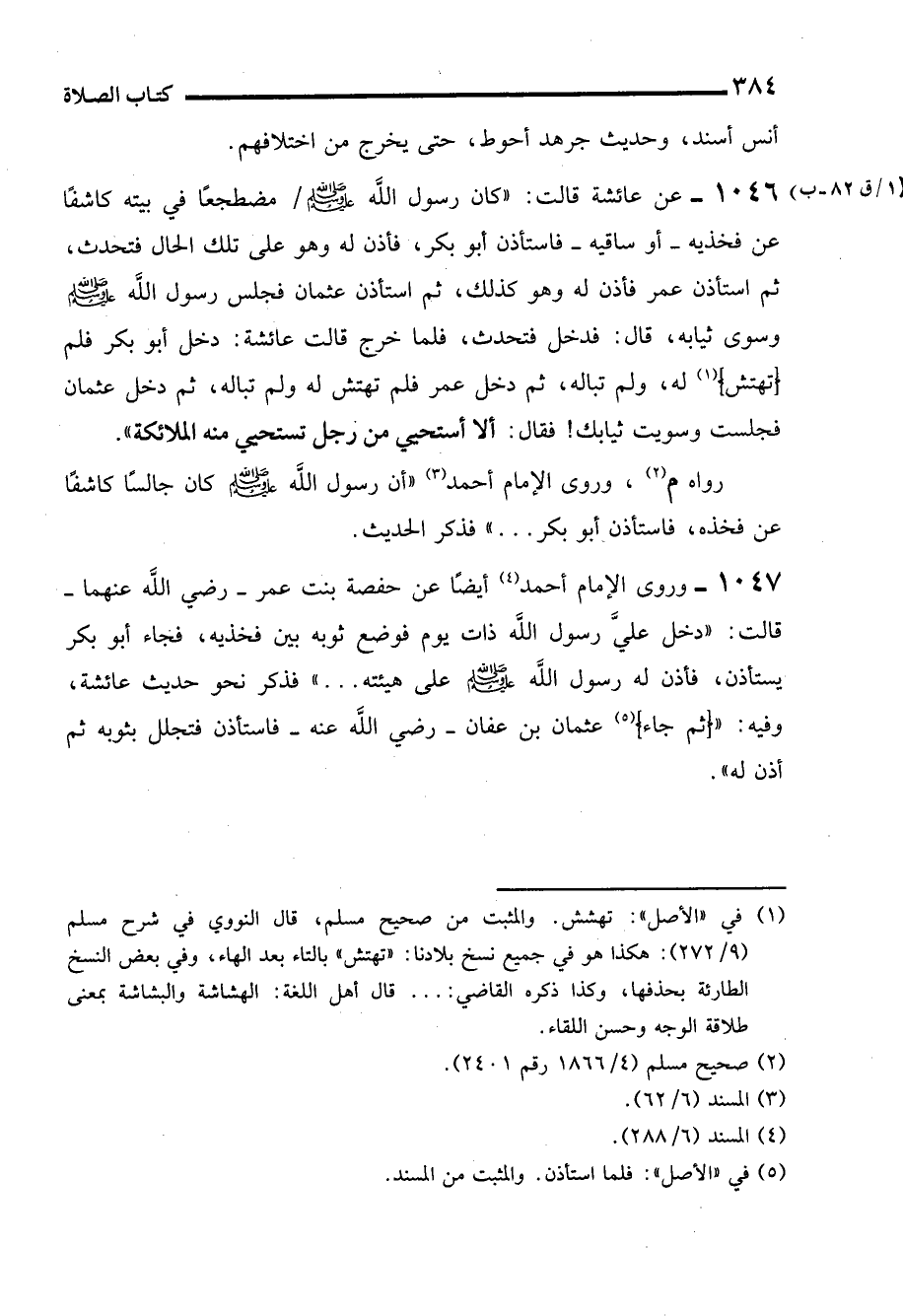 1046 - عن عائشة قالت: "كان رسول الله - صلى الله عليه وسلم - مضطجعًا في بيته كاشفًا عن فخذيه -أو ساقيه- فاستأذن أبو بكر، فأذن له وهو على تلك الحال فتحدث، ثم استأذن عمر فأذن له وهو كذلك، ثم استأذن عثمان فجلس رسول الله - صلى الله عليه وسلم - وسوى ثيابه، قال: فدخل فتحدث، فلما خرج قالت عائشة: دخل أبو بكر فلم (تهتش) (¬1) له، ولم تباله، ثم دخل عمر فلم تهتش له ولم تباله، ثم دخل عثمان فجلست وسويت ثيابك فقال: ألا أستحي من رجل تستحيي منه الملائكة".