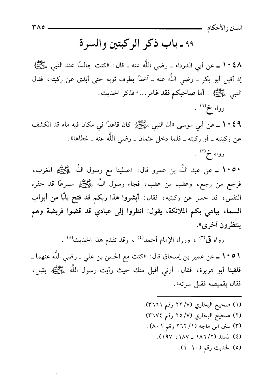 1051 - عن عمير بن إسحاق قال: "كنت مع الحسن بن علي -رضي الله عنهما- فلقينا أبو هريرة، فقال: أرني أقبل منك حيث رأيت رسول الله - صلى الله عليه وسلم - يقبل، فقال بقميصه فقبل سرته".