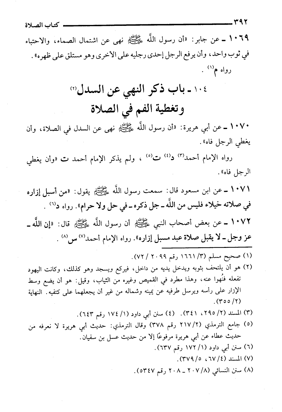 1070 - عن أبي هريرة: "أن رسول الله - صلى الله عليه وسلم - نهى عن السدل في الصلاة، وأن يغطي الرجل فاه".