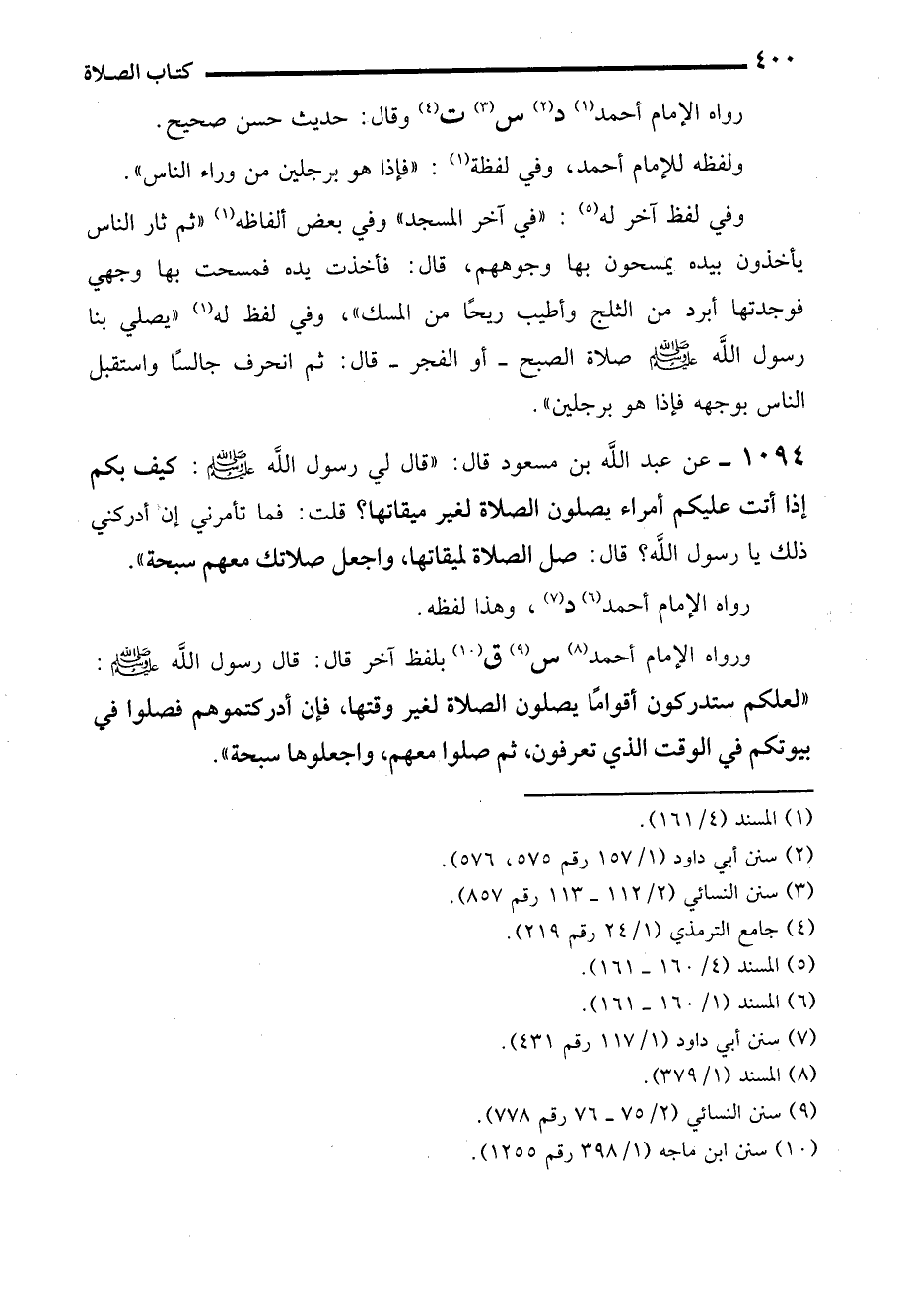 1094 - عن عبد الله بن مسعود قال: "قال لي رسول الله - صلى الله عليه وسلم -: كيف بكم إذا أتت عليكم أمراء يصلون الصلاة لغير ميقاتها؟ قلت: فما تأمرني إن أدركني ذلك يا رسول الله؟ قال: صل الصلاة لميقاتها، واجمل صلاتك معهم سبحة".