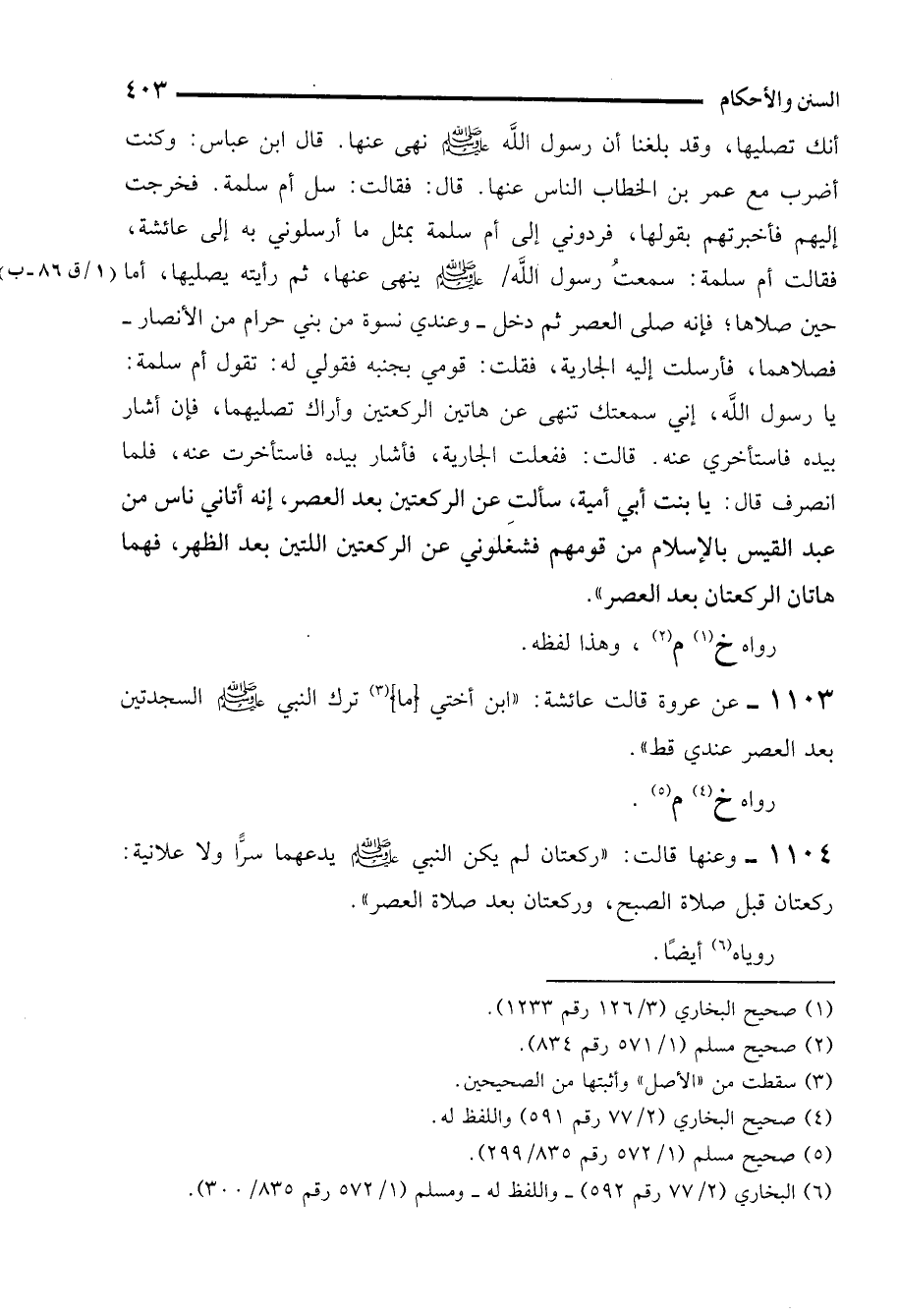 أنك تصليها، وقد بلغنا أن رسول الله - صلى الله عليه وسلم - نهى عنها. قال ابن عباس: وكنت أضرب مع عمر بن الخطاب الناس عنها. قال: فقالت: سل أم سلمة. فخرجت إليهم فأخبرتهم بقولها، فردوني إلى أم سلمة بمثل ما أرسلوني به إلى عائشة، فقالت أم سلمة: سمعتُ رسول الله - صلى الله عليه وسلم - ينهى عنها، ثم رأيته يصليها، أما حين صلاها؛ فإنه صلى العصر ثم دخل -وعندي نسوة من بني حرام من الأنصار- فصلاهما، فأرسلت إليه الجارية، فقلت: قومي بجنبه فقولي له: تقول أم سلمة: يا رسول الله، إني سمعتك تنهى عن هاتين الركعتين وأراك تصليهما، فإن أشار بيده فاستأخري عنه. قالت: ففعلت الجارية، فأشار بيده فاستأخرت عنه، فلما انصرف قال: يا بنت أبي أمية، سألت عن الركعتين بعد العصر، إنه أتاني ناس من عبد القيس بالإسلام من قومهم فشغَلوني عن الركعتين اللتين بعد الظهر، فهما هاتان الركعتان بعد العصر".