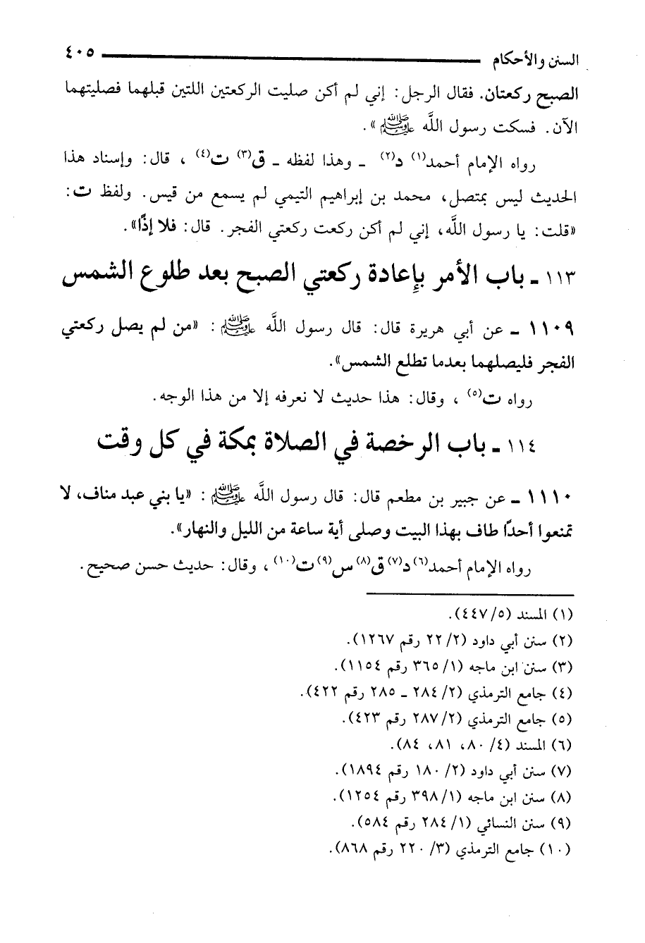 1110 - عن جبير بن مطعم قال: قال رسول الله - صلى الله عليه وسلم -: "يا بني عبد مناف، لا تمنعوا أحدًا طاف بهذا البيت وصلى أية ساعة من الليل والنهار".