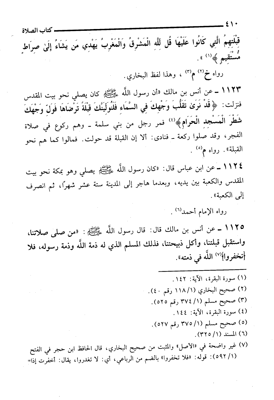 1123 - عن أنس بن مالك "أن رسول الله - صلى الله عليه وسلم - كان يصلي نحو بيت المقدس فنزلت: {قَدْ نَرَى تَقَلُّبَ وَجْهِكَ فِي السَّمَاءِ فَلَنُوَلِّيَنَّكَ قِبْلَةً تَرْضَاهَا فَوَلِّ وَجْهَكَ شَطْرَ الْمَسْجِدِ الْحَرَامِ} (¬4) فمر رجل من بني سلمة -وهم ركوع في صلاة الفجر، وقد صلوا ركعة- فنادى: ألا إن القبلة قد حولت. فمالوا كما هم نحو القبلة". رواه م (¬5).