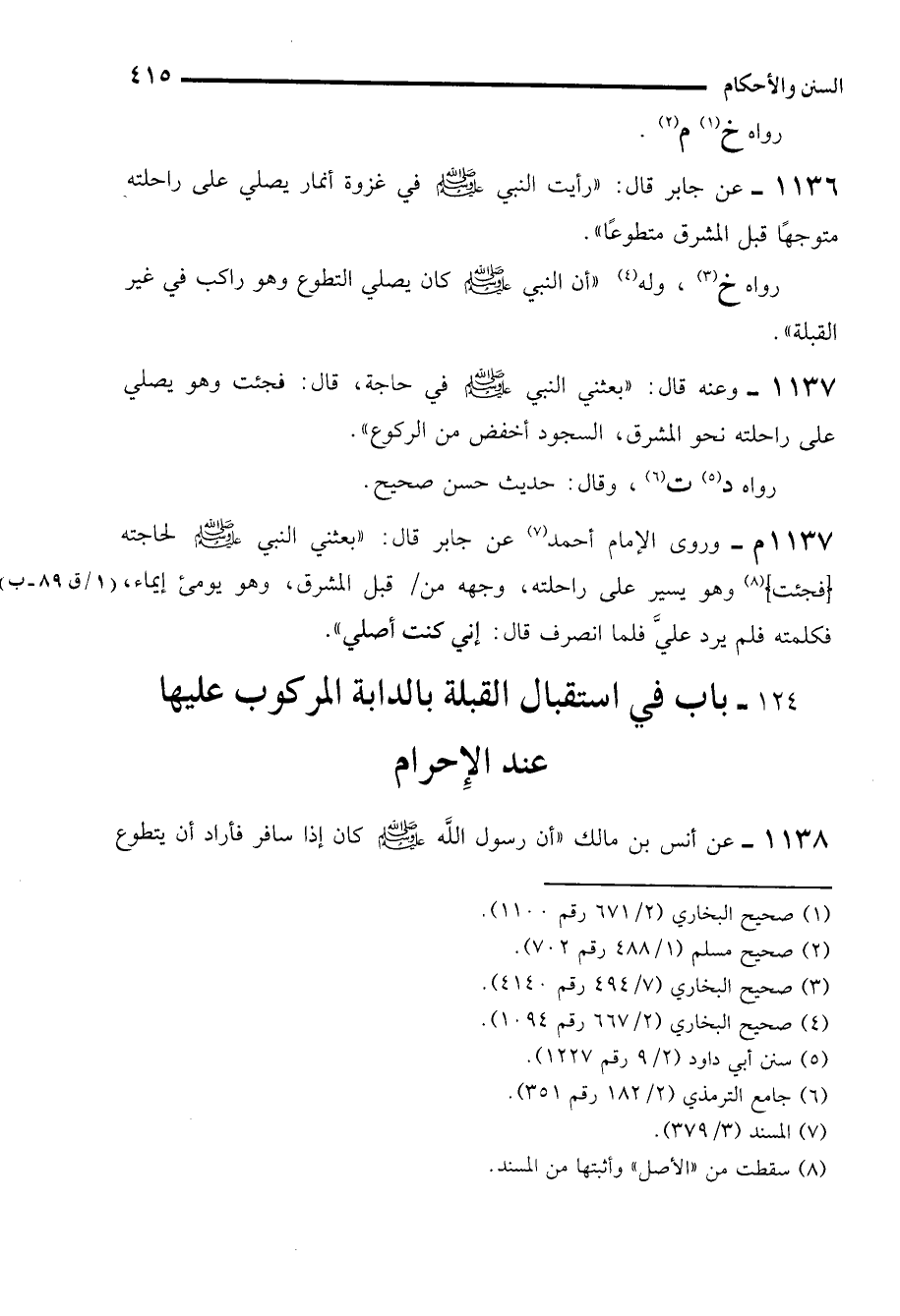 1137 م - وروى الإمام أحمد (¬7) عن جابر قال: "بعثني النبي - صلى الله عليه وسلم - لحاجته (فجئت) (¬8) وهو يسير على راحلته، وجهه من قبل المشرق، وهو يومى إيماء، فكلمته فلم يرد عليَّ فلما انصرف قال: إني كنت أصلي".