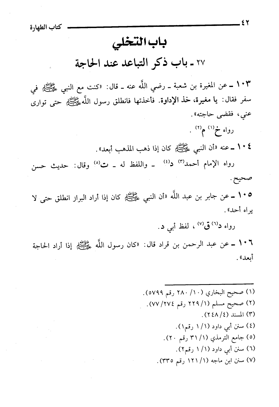 106 - عن عبد الرحمن بن قراد قال: "كان رسول الله - صلى الله عليه وسلم - إذا أراد الحاجة أبعد".