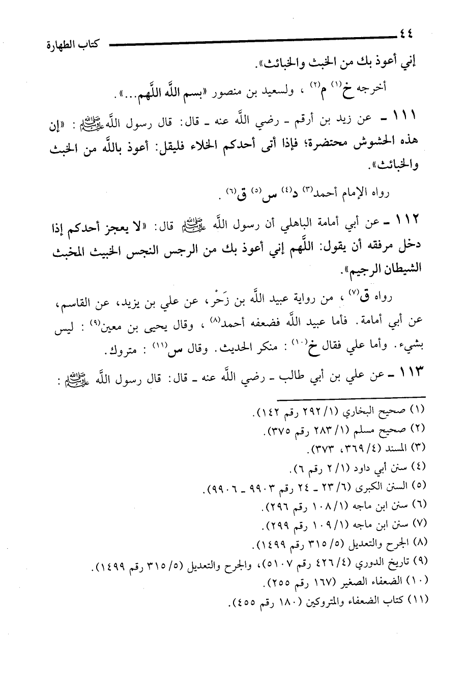 111 - عن زيد بن أرقم -رضي الله عنه- قال: قال رسول الله - صلى الله عليه وسلم - هذه الحشوش محتضرة؛ فإذا أتى أحدكم الخلاء فليقل: أعوذ باللَّه من الخبث والخبائث".