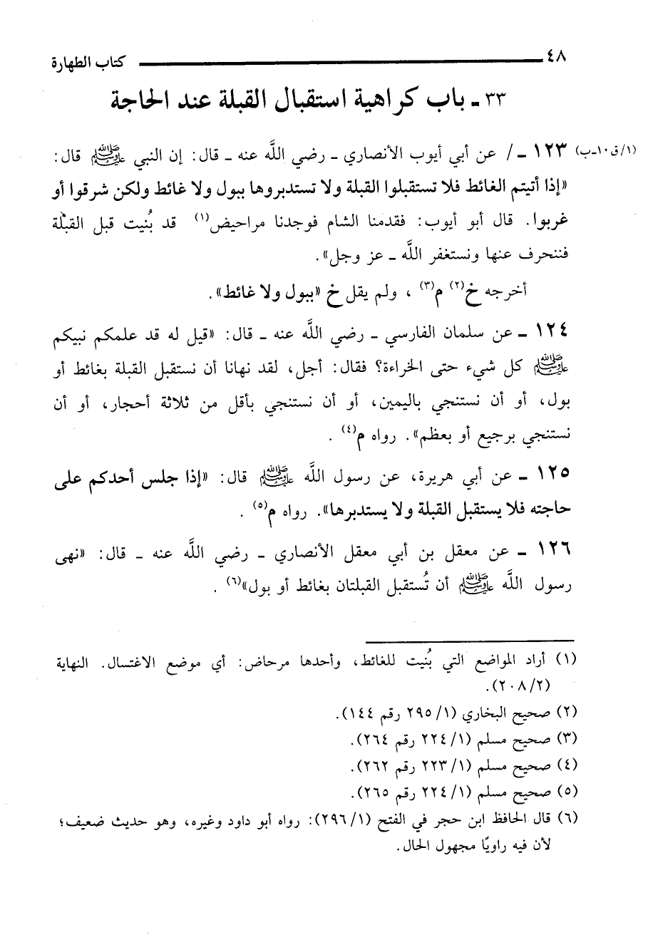 125 - عن أبي هريرة، عن رسول الله - صلى الله عليه وسلم - قال: "إذا جلس أحدكم على حاجته فلا يستقبل القبلة ولا يستدبرها". رواه م (¬5).