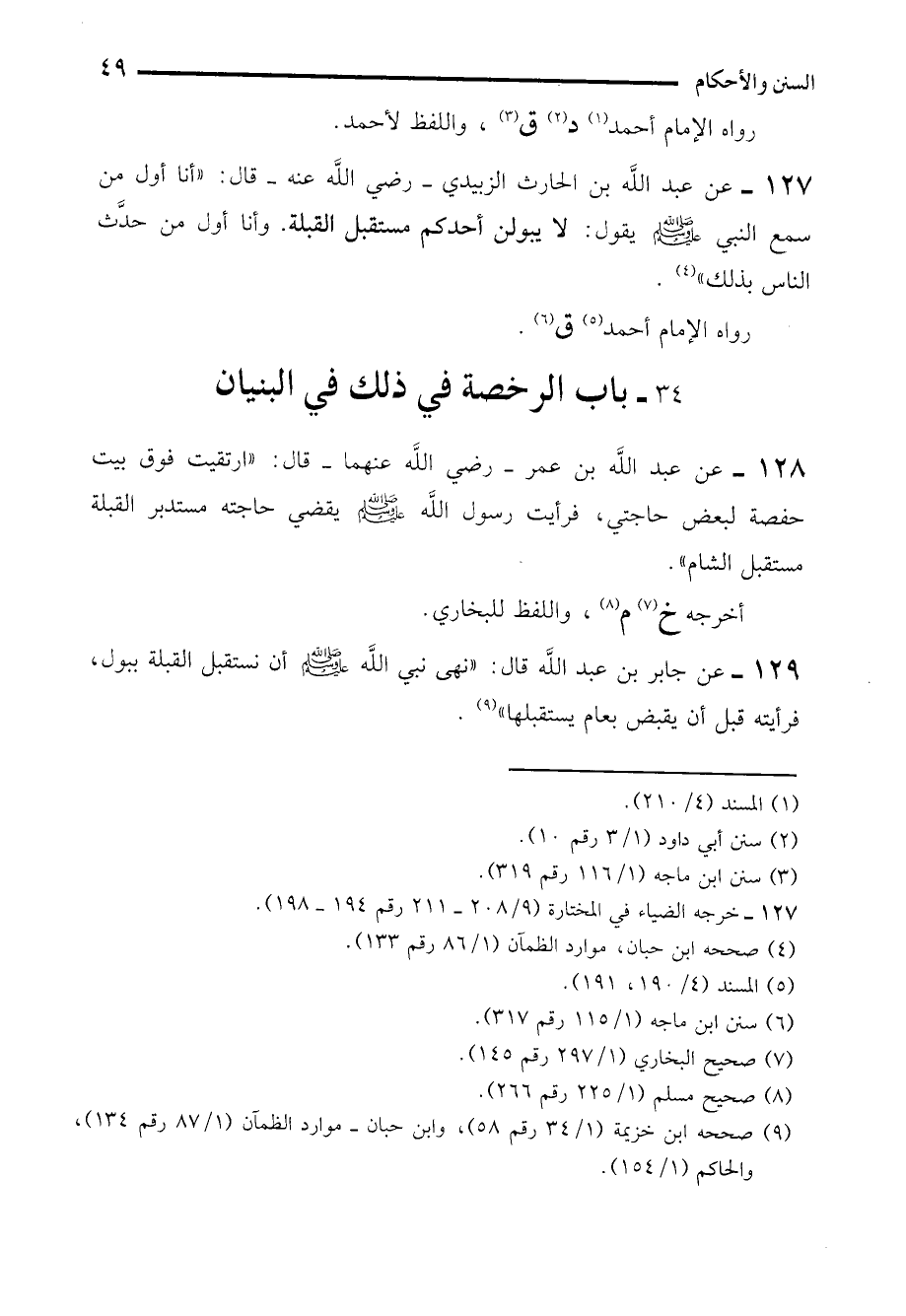 128 - عن عبد الله بن عمر -رضي الله عنهما- قال: "ارتقيت فوق بيت حفصة لبعض حاجتي، فرأيت رسول الله - صلى الله عليه وسلم - يقضي حاجته مستدبر القبلة مستقبل الشام".