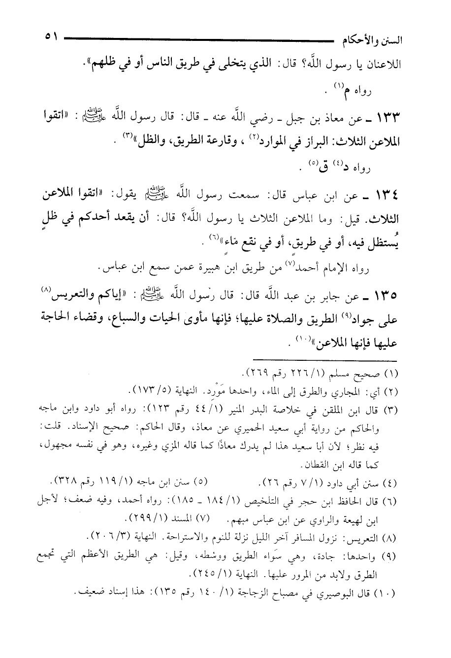 133 - عن معاذ بن جبل -رضي الله عنه- قال: قال رسول الله - صلى الله عليه وسلم - "اتقوا الملاعن الثلاث: البراز في الموارد (¬2)، وقارعة الطريق، والظل" (¬3).