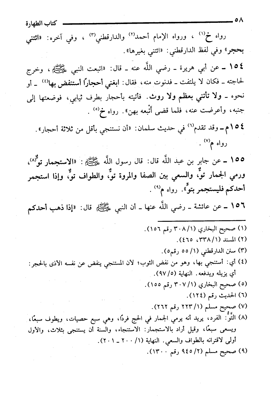 155 - عن جابر بن عبد الله قال: قال رسول - صلى الله عليه وسلم -: "الاستجمار توٌّ (¬8)، ورمي الجمار توٌّ، والسعي بين الصفا والمروة توٌّ، والطواف توٌّ، وإذا استجمر أحدكم فليستجمر بتوٍّ". رواه م (¬9).
