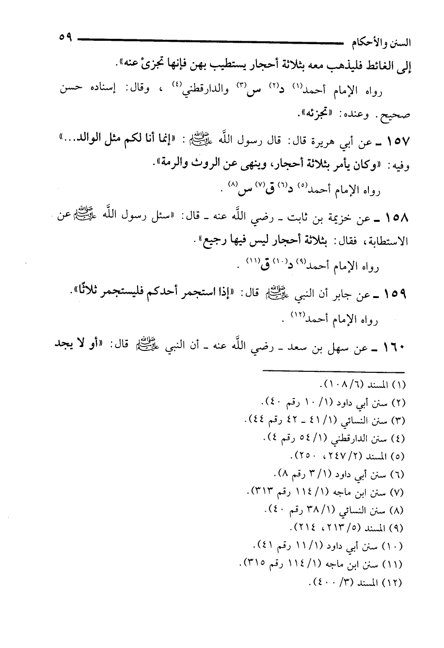 157 - عن أبي هريرة قال: قال رسول الله - صلى الله عليه وسلم -: "إنما أنا لكم مثل الوالد ... " وفيه: "وكان يأمر بثلاثة أحجار، وينهى عن الروث والرمة".