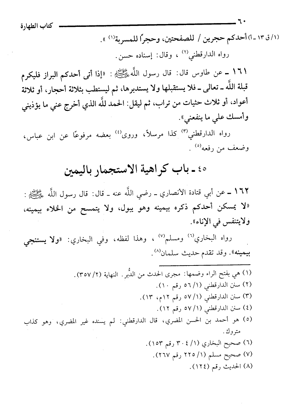 162 - عن أبي قتادة الأنصاري -رضي الله عنه- قال: قال رسول الله - صلى الله عليه وسلم - "لا يمسكن أحدكم ذكره بيمينه وهو يبول، ولا يتمسح من الخلاء بيمينه، ولا يتنفس في الإناء".