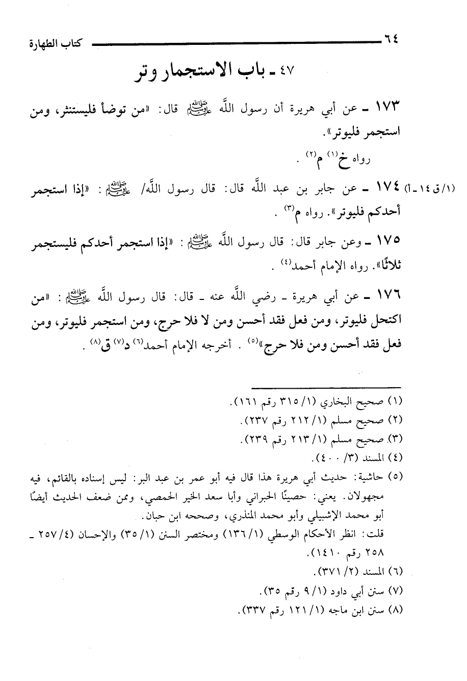 174 - عن جابر بن عبد الله قال: قال رسول الله - صلى الله عليه وسلم -: "إذا استجمر أحدكم فليوتر". رواه م (¬3).
