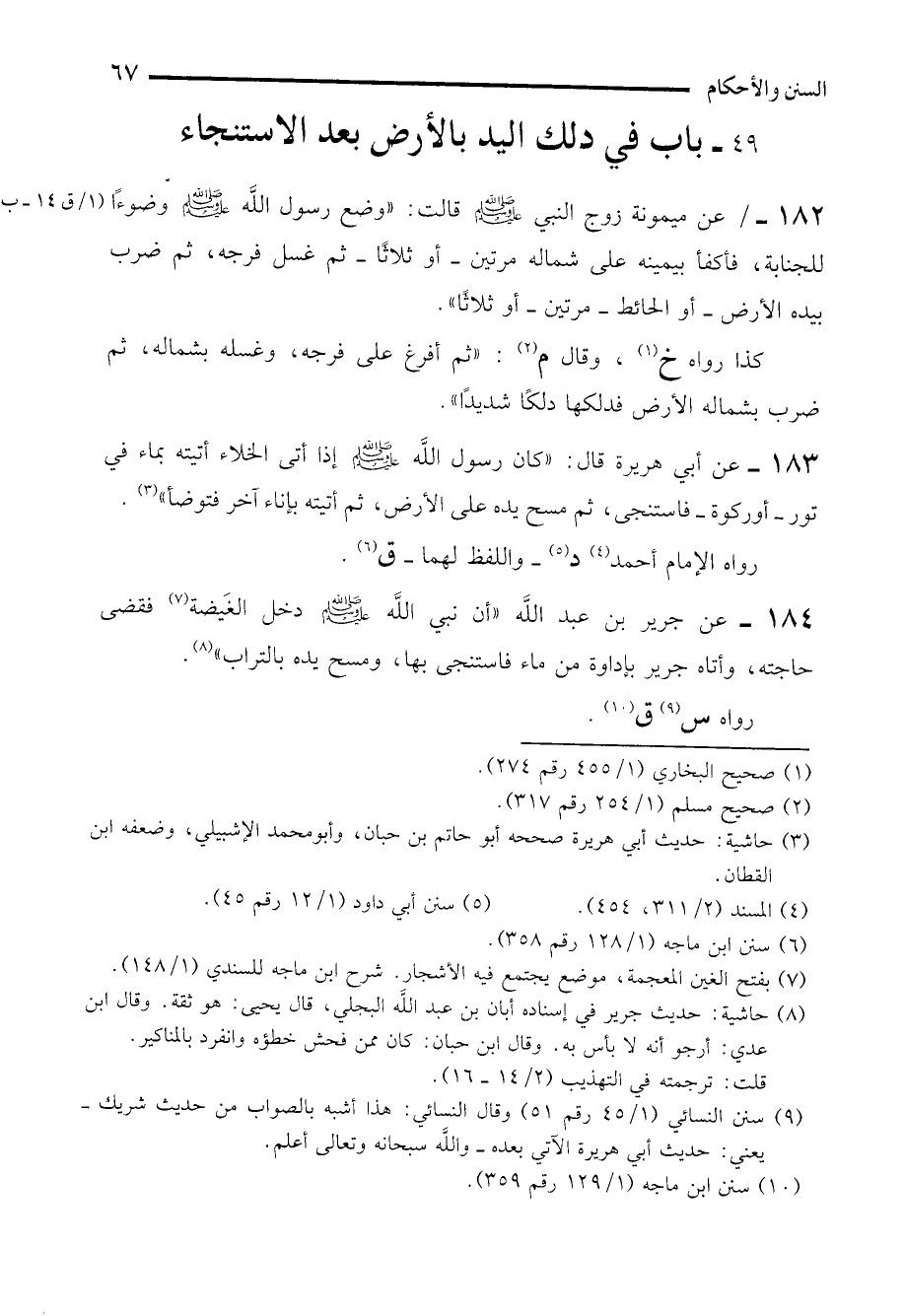 184 - عن جرير بن عبد الله "أن نبي الله - صلى الله عليه وسلم - دخل الغَيضة (¬7) فقضى حاجته، وأتاه جرير يإداوة من ماء، فاستنجى بها، ومسح يده بالتراب" (¬8).