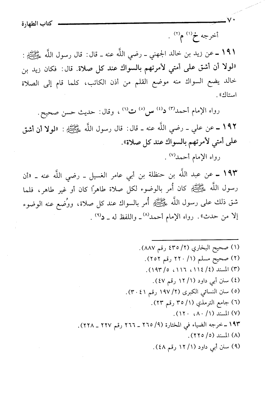 191 - عن زيد بن خالد الجهني -رضي الله عنه- قال: قال رسول الله - صلى الله عليه وسلم -: "لولا أن أشق على أمتي لأمرتهم بالسواك عند كل صلاة. قال: فكان زيد بن خالد يضع السواك منه موضع القلم من أذن الكاتب، كلما قام إلى الصلاة استاك".
