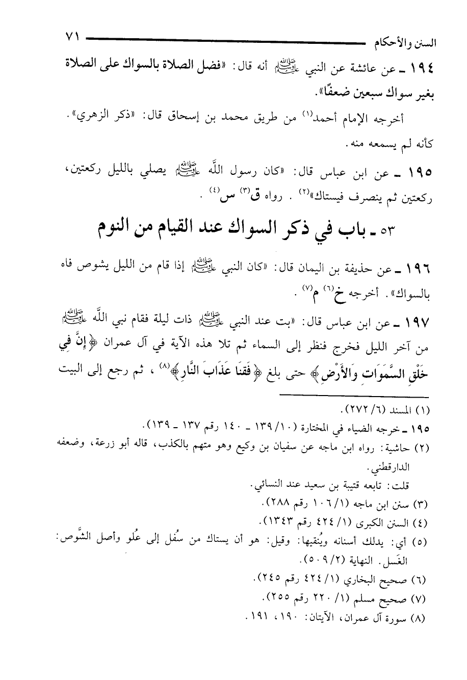 195 - عن ابن عباس قال: "كان رسول اللَّه - صلى الله عليه وسلم - يصلي بالليل ركعتين، ركعتين ثم ينصرف فيستاك" (¬2). رواه ق (¬3) س (¬4).