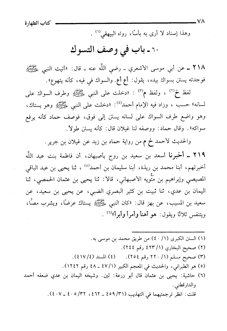 218 - عن أبي موسى الأشعري -رضي الله عنه- قال: "أتيت النبي - صلى الله عليه وسلم - فوجدته يستن بسواك بيده، يقول: أع أع. والسواك في فيه، كأنه يتهوع".