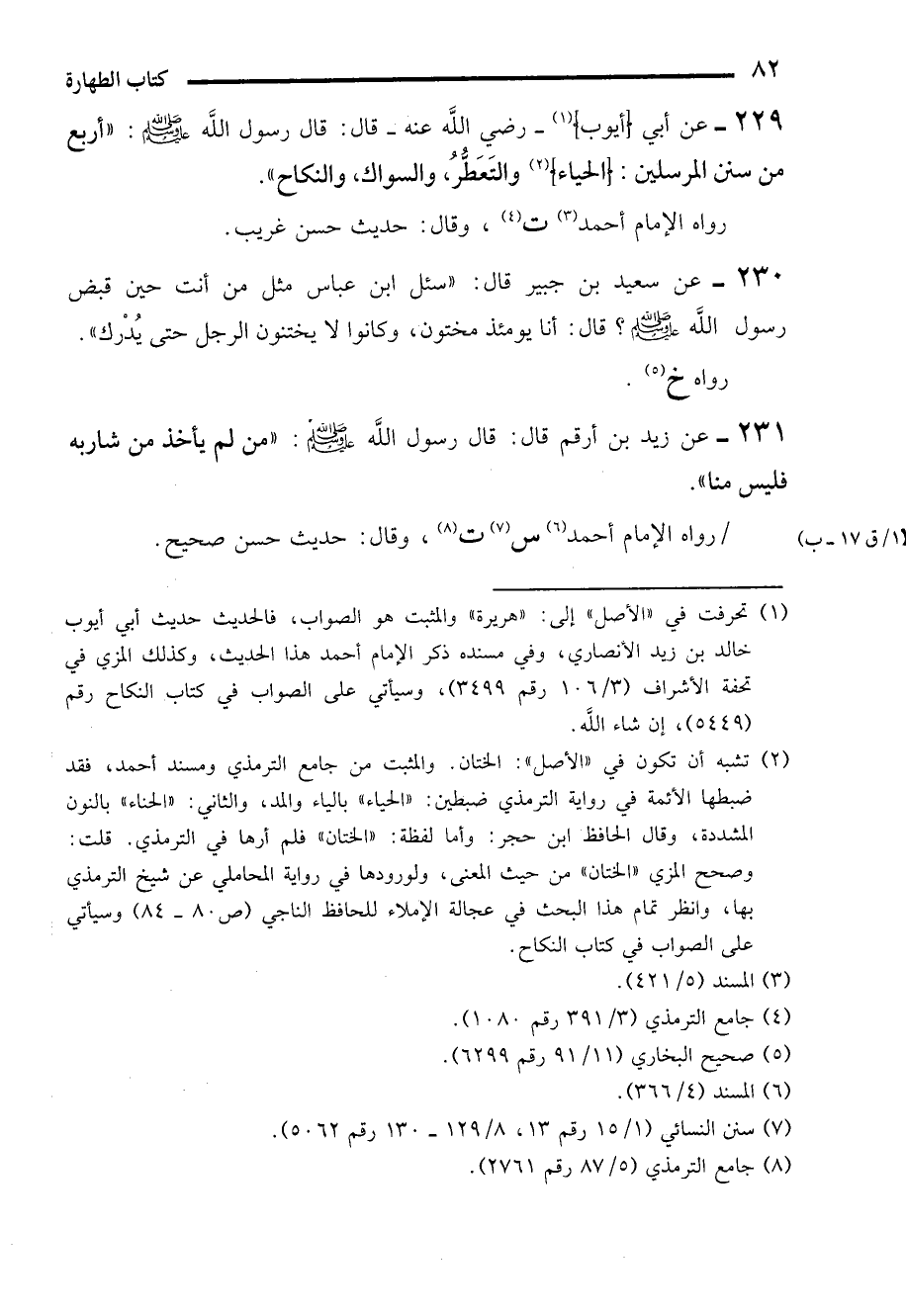 (¬2) تشبه أن تكون في "الأصل": الختان. والمثبت من جامع الترمذي ومسند أحمد، فقد ضبطها الأئمة في رواية الترمذي ضبطين: "الحياء" بالياء والمد، والثاني، "الحناء" بالنون المشددة، وقال الحافظ ابن حجر: وأما لفظة: "الختان" فلم أرها في الترمذي. قلت: وصحح المزي "الختان" من حيث المعنى، ولورودها في رواية المحاملي عن شيخ الترمذي بها، وانظر تمام هذا البحث في عجالة الإملاء للحافظ الناجي (ص 80 - 84) وسيأتي على الصواب في كتاب النكاح.