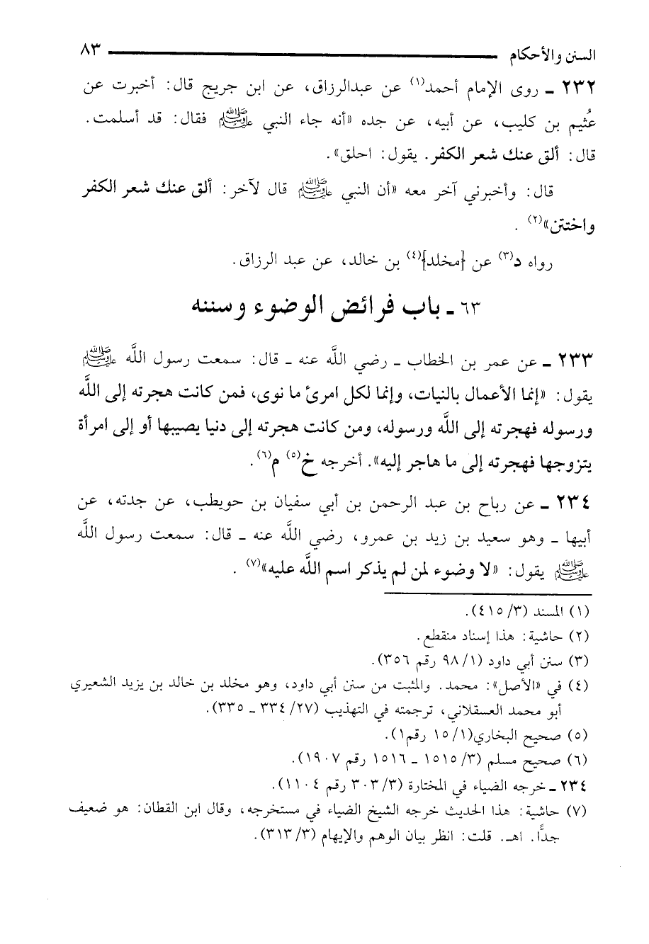 233 - عن عمر بن الخطاب -رضي الله عنه- قال: سمعت رسول الله - صلى الله عليه وسلم - يقول: "إنما الأعمال بالنيات، وإنما لكل امرئ ما نوى، فمن كانت هجرته إلى الله ورسوله فهجرته إلى الله ورسوله، ومن كانت هجرته إلى دنيا يصيبها أو إلى امرأة يتزوجها فهجرته إلى ما هاجر إليه". أخرجه خ (¬5) م (¬6).