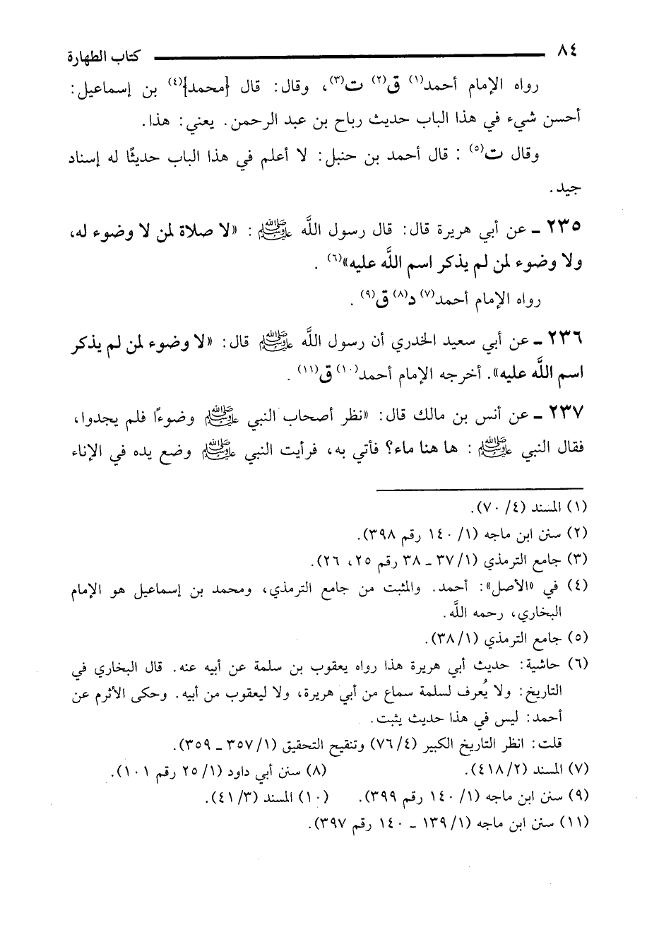 235 - عن أبي هريرة قال: قال رسول اللَّه - صلى الله عليه وسلم -: "لا صلاة لمن لا وضوء له، ولا وضوء لمن لم يذكر اسم الله عليه" (¬6).