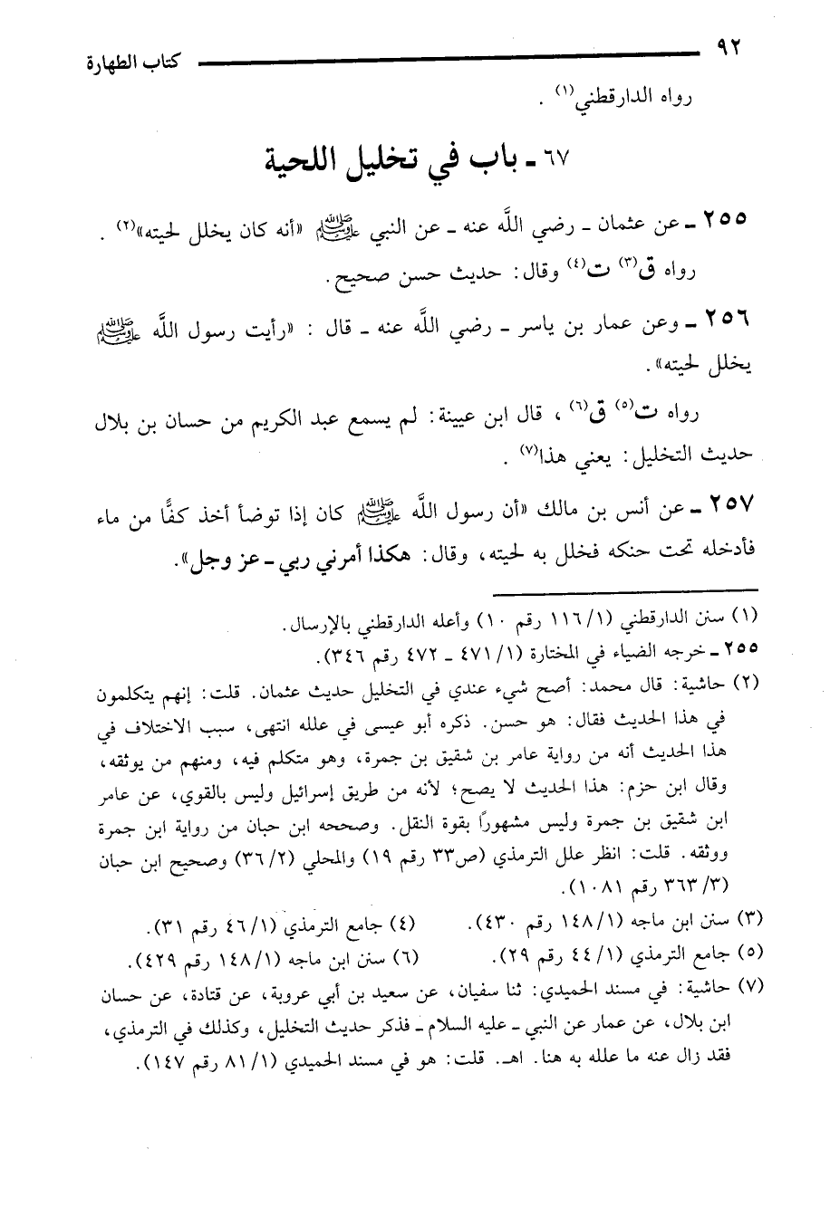 255 - عن عثمان -رضي الله عنه- عن النبي - صلى الله عليه وسلم - "أنه كان يخلل لحيته" (¬2).