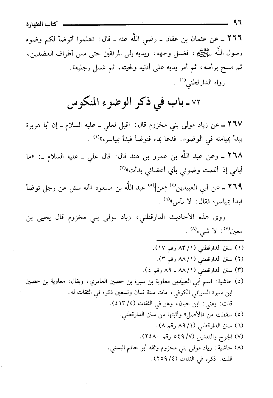 267 - عن زياد مولى بني مخزوم قال: "قيل لعلي -عليه السلام- إن أبا هريرة يبدأ بميامنه في الوضوء. فدعا بماء فتوضأ فبدأ بمياسره" (¬2).