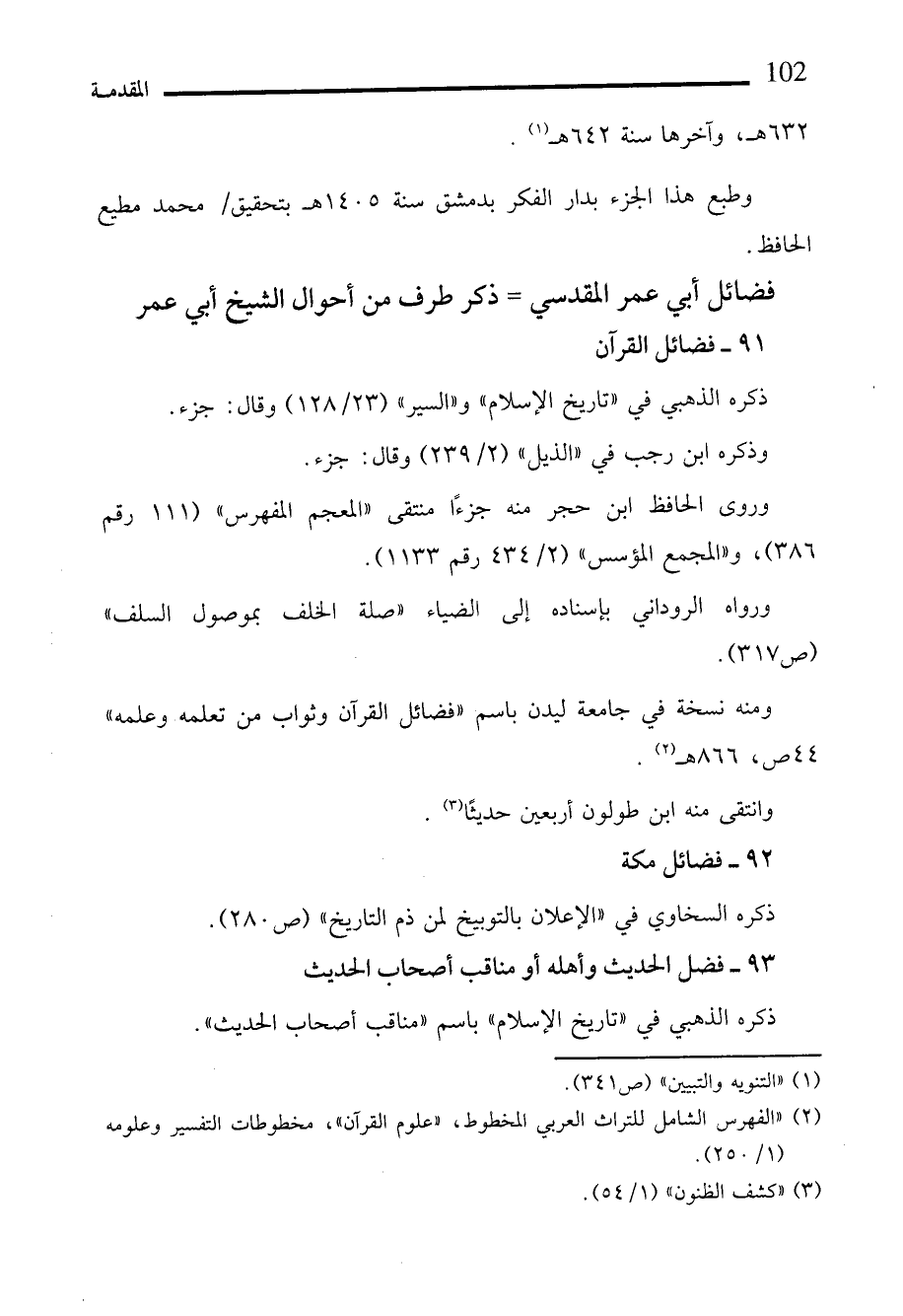 ومنه نسخة في جامعة ليدن باسم "فضائل القرآن وثواب من تعلمه وعلمه" 44 ص، 866 هـ (¬2).