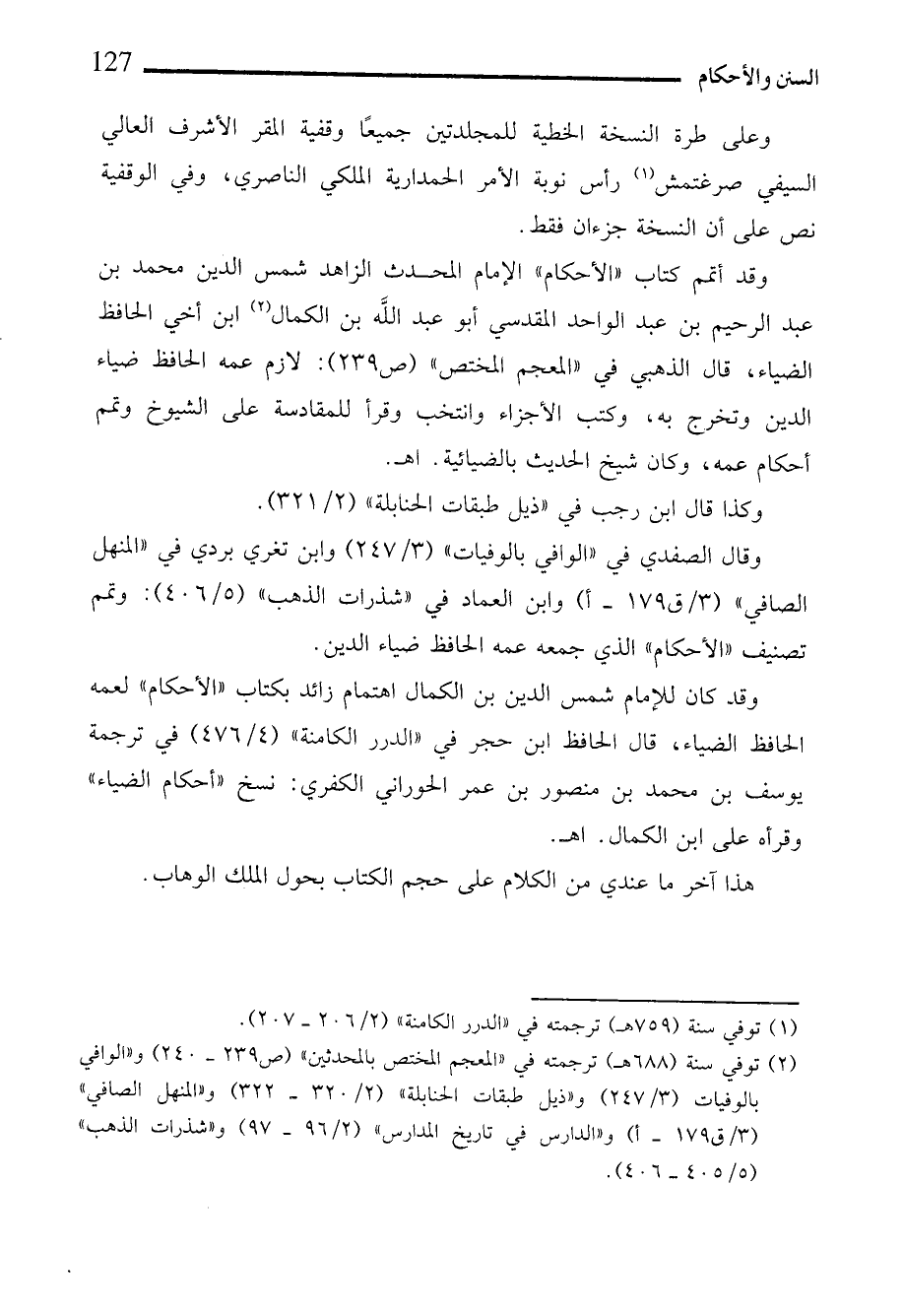 وقد أتمم كتاب "الأحكام" الإمام المحدث الزاهد شمس الدين محمد بن عبد الرحيم بن عبد الواحد المقدسي أبو عبد الله بن الكمال (¬2) ابن أخي الحافظ الضياء، قال الذهبي في "المعجم المختص" (ص 239): لازم عمه الحافظ ضياء الدين وتخرج به، وكتب الأجزاء وانتخب وقرأ للمقادسة على الشيوخ وتمم أحكام عمه، وكان شيخ الحديث بالضيائية. اهـ.