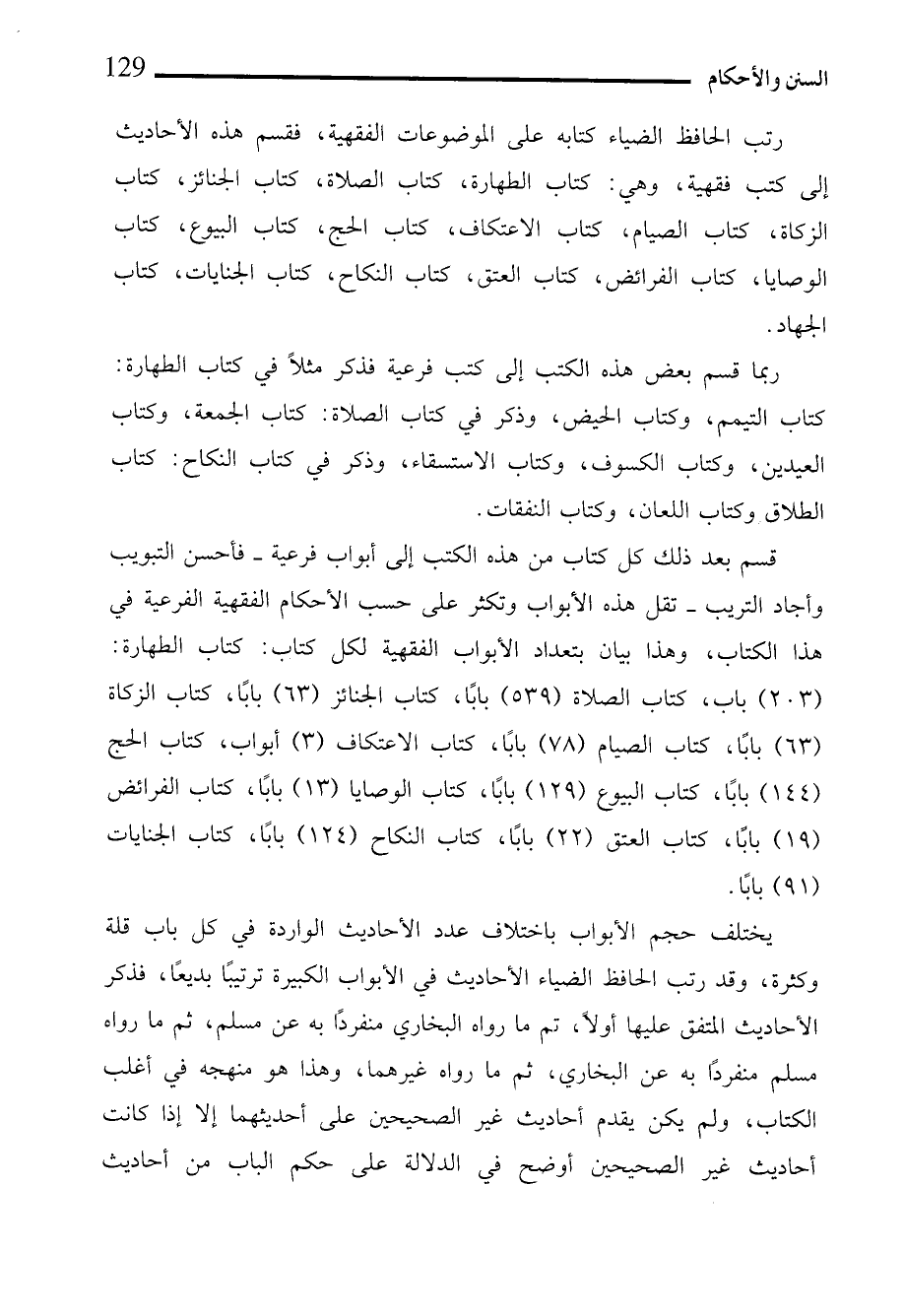رتب الحافظ الضياء كتابه على الموضوعات الفقهية، فقسم هذه الأحاديث إلى كتب فقهية، وهي: كتاب الطهارة، كتاب الصلاة، كتاب الجنائز، كتاب الزكاة، كتاب الصيام، كتاب الاعتكاف، كتاب الحج، كتاب البيوع، كتاب الوصايا، كتاب الفرائض، كتاب العتق، كتاب النكاح، كتاب الجنايات، كتاب الجهاد.