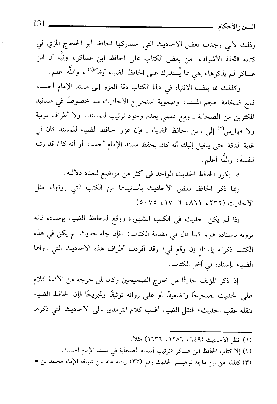 وكذلك مما يلفت الانتباه في هذا الكتاب دقة العزو إلى مسند الإمام أحمد، فمع ضخامة حجم المسند، وصعوبة استخراج الأحاديث منه خصوصًا في مسانيد الكثرين من الصحابة -ومع علمي بعدم وجود ترتيب للمسند، ولا أطراف مرتبة ولا فهارس (¬2) إلى زمن الحافظ الضياء- فإن عزو الحافظ الضياء للمسند كان في غاية الدقة حتى يخيل إليك أنه كان يحفظ مسند الإمام أحمد، أو أنه كان قد رتبه لنفسه، واللَّه أعلم.