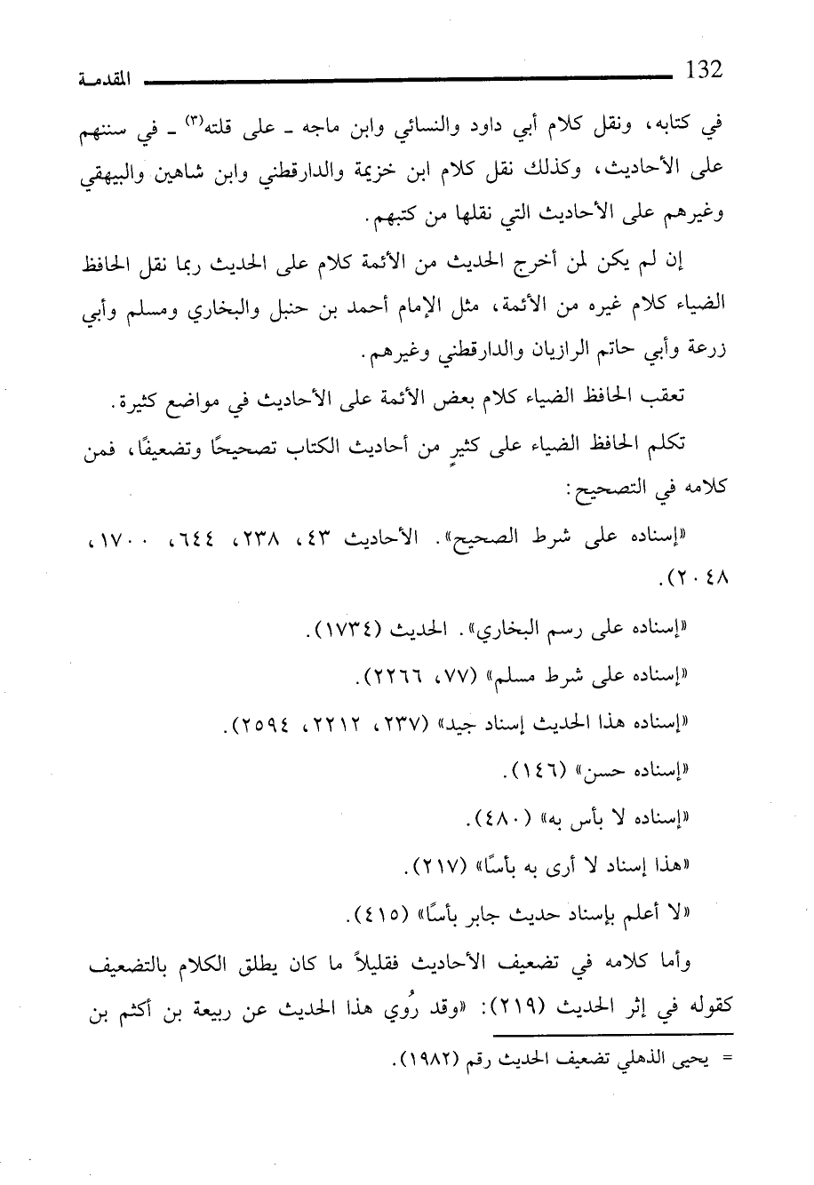 إن لم يكن لمن أخرج الحديث من الأئمة كلام على الحديث ربما نقل الحافظ الضياء كلام غيره من الأئمة، مثل الإمام أحمد بن حنبل والبخاري ومسلم وأبي زرعة وأبي حاتم الرازيان والدارقطني وغيرهم.