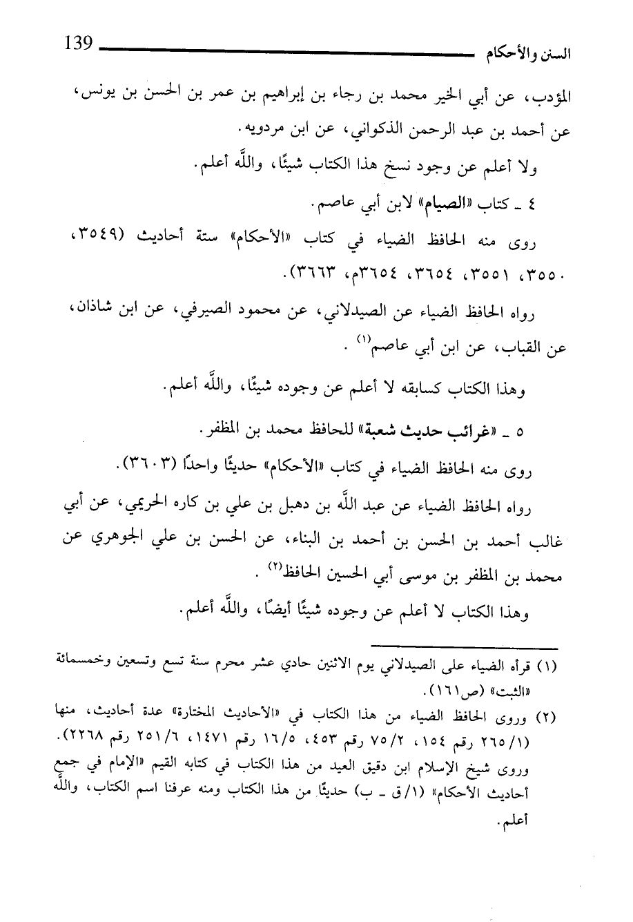 (¬2) وروى الحافظ الضياء من هذا الكتاب في "الأحاديث المختارة" عدة أحاديث، منها (1/ 265 رقم 154، 2/ 75 رقم 453، 5/ 16 رقم 1471، 6/ 251 رقم 2268). وروى شيخ الإسلام ابن دقيق العيد من هذا الكتاب في كتابه القيم "الإمام في جمع أحاديث الأحكام" (1/ ق-ب) حديثًا من هذا الكتاب ومنه عرفنا اسم الكتاب، واللَّه أعلم.