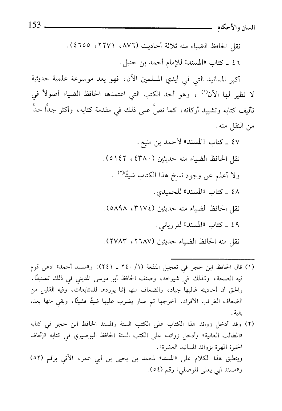 أكبر المسانيد التي في أيدي المسلمين الآن، فهو يعد موسوعة علمية حديثية لا نظير لها الآن (¬1)، وهو أحد الكتب التي اعتمدها الحافظ الضياء أصولاً في تأليف كتابه وتشييد أركانه، كما نصَّ على ذلك في مقدمة كتابه، وأكثر جدًّا جدًّا من النقل منه.