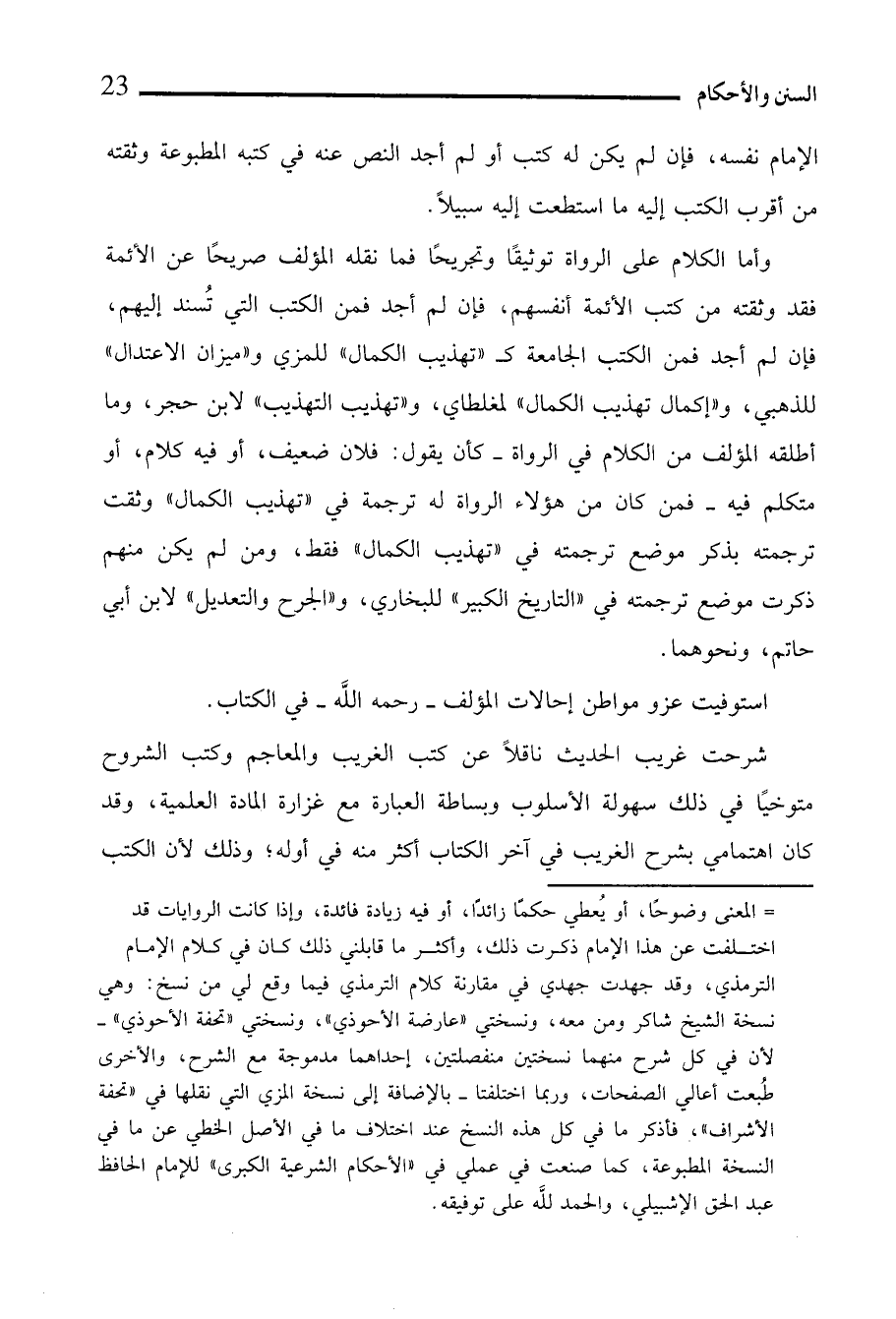 = المعنى وضوحًا، أو يُعطي حكماً زائداً، أو فيه زيادة فائدة، وإذا كانت الروايات قد اختلفت عن هذا الإمام ذكرت ذلك، وأكثر ما قابلني ذلك كان في كلام الإمام الترمذي، وقد جهدت جهدي في مقارنة كلام الترمذي فيما وقع لي من نسخ: وهي نسخة الشيخ شاكر ومن معه، ونسختي "عارضة الأحوذي"، ونسختي "تحفة الأحوذي" -لأن في كل شرح منهما نسختين منفصلتين، إحداهما مدموجة مع الشرح، والأخرى طُبعت أعالي الصفحات، وربما اختلفتا -بالإضافة إلى نسخة المزي التي نقلها في "تحفة الأشراف"، فأذكر ما في كل هذه النسخ عند اختلاف ما في الأصل الخطي عن ما في النسخة المطبوعة، كما صنعت في عملي في "الأحكام الشرعية الكبرى" للإمام الحافظ عبد الحق الإشبيلي، والحمد لله على توفيقه.