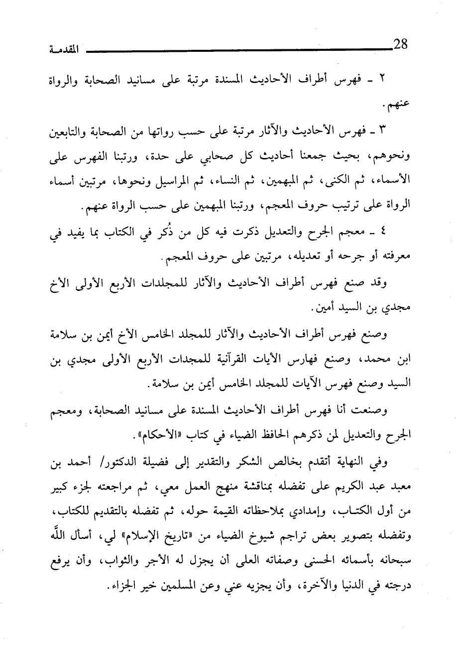 وصنعت أنا فهرس أطراف الأحاديث المسندة على مسانيد الصحابة، ومعجم الجرح والتعديل لمن ذكرهم الحافظ الضياء في كتاب "الأحكام".