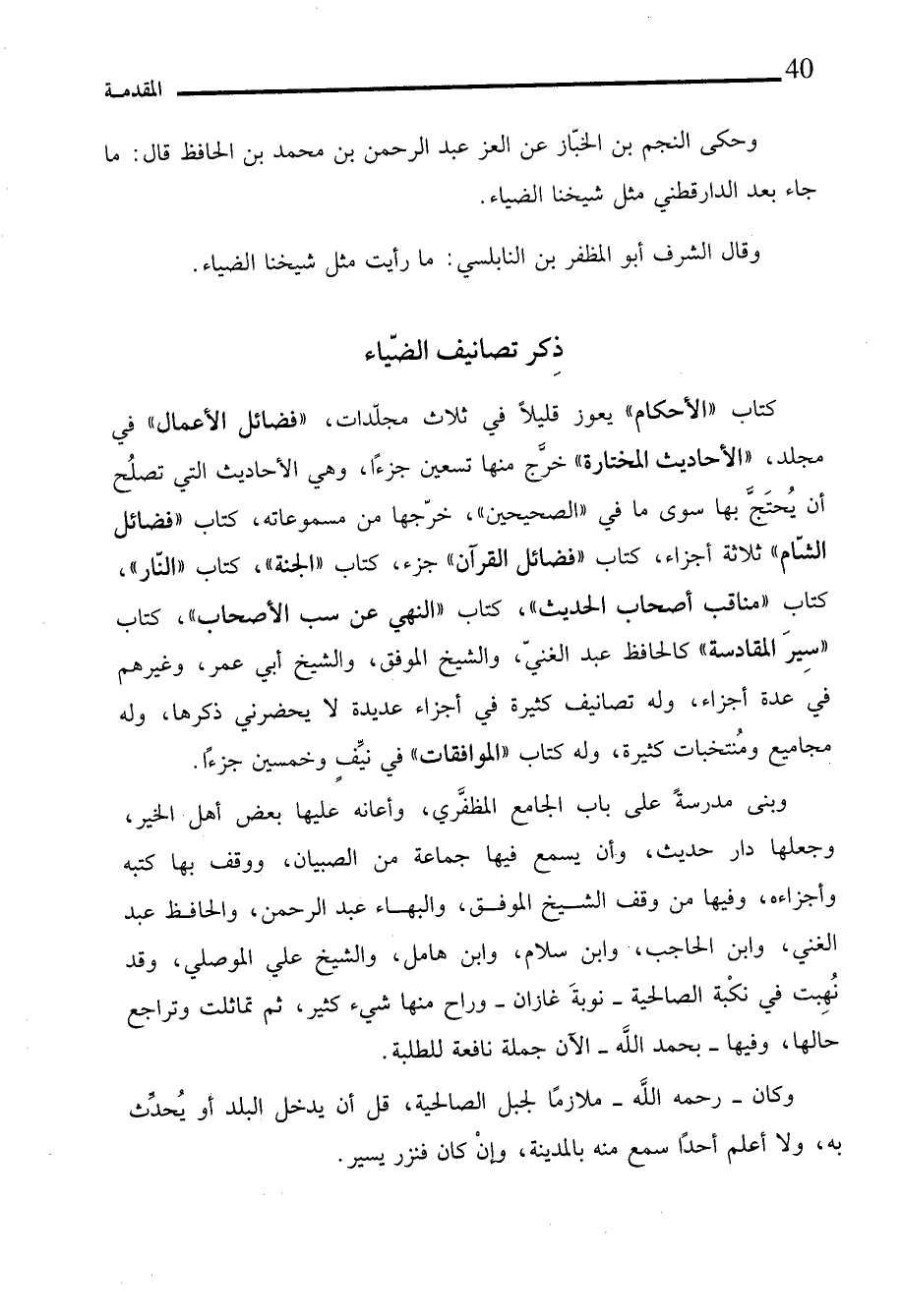كتاب "الأحكام" يعوز قليلاً في ثلاث مجلّدت "فضائل الأعمال" في مجلد، "الأحاديث المختارة" خرَّجَ منها تسعين جزءًا، وهي الأحاديث التي تصلُح أن يُحتَجَّ بها سوى ما في "الصحيحين"، خرّجها من مسموعاته، كتاب "فضائل الشّام" ثلاثة أجزاء، كتاب "فضائل القرآن" جزء، كتاب "الجنة"، كتاب "النّار"، كتاب "مناقب أصحاب الحديث"، كتاب "النهي عن سب الأصحاب"، كتاب "سِيرَ المقادسة" كالحافظ عبد الغنيّ، والشيخ الموفق، والشيخ أبي عمر، وغيرهم في عدة أجزاء، وله تصانيف كثيرة في أجزاء عديدة لا يحضرني ذكرها، وله مجاميع ومُنتخبات كثيرة، وله كتاب "الموافقات" في نيِّفٍ وخمسين جزءًا.
