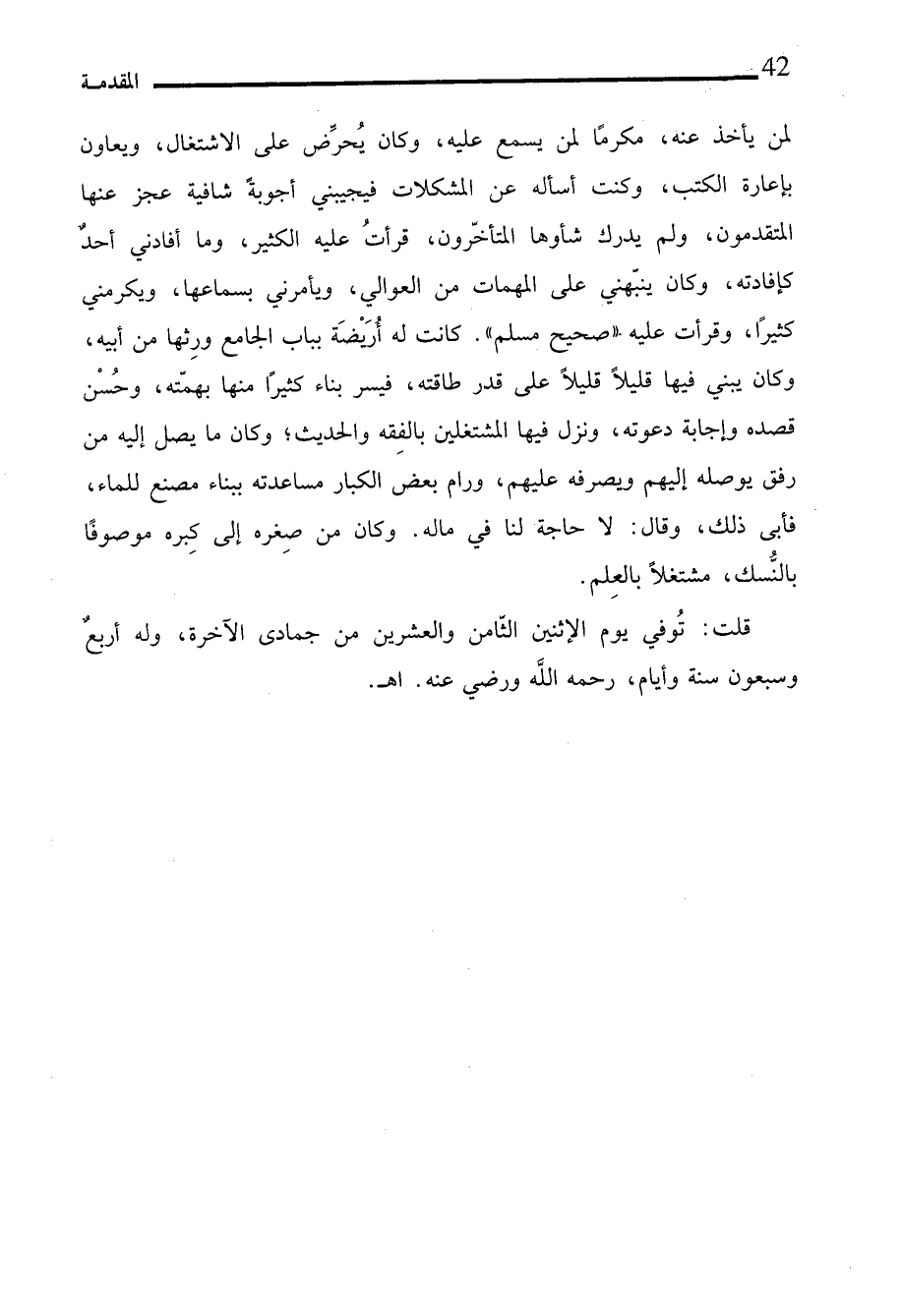 لمن يأخذ عنه، مكرمًا لمن يسمع عليه، وكان يُحرِّض على الاشتغال، ويعاون بإعارة الكتب، وكنت أسأله عن المشكلات فيجيبني أجوبةً شافية عجز عنها المتقدمون، ولم يدرك شأوها المتأخّرون، قرأتُ عليه الكثير، وما أفادني أحدٌ كإفادته، وكان ينبّهني على المهمات من العوالي، ويأمرني بسماعها، ويكرمني كثيرًا، وقرأت عليه "صحيح مسلم". كانت له أُرَيْضَة بباب الجامع ورِثها من أبيه، وكان يبني فيها قليلاً قليلاً على قدر طاقته، فيسر بناء كثيرًا منها بهمّته، وحُسْن قصده وإجابة دعوته، ونزل فيها المشتغلين بالفِقه والحديث؛ وكان ما يصل إليه من رفق يوصله إليهم ويصرفه عليهم، ورام بعض الكبار مساعدته ببناء مصنع للماء، فأبى ذلك، وقال: لا حاجة لنا في ماله. وكان من صغره إلى كِبره موصوفًا بالنُّسك، مشتغلاً بالعِلم.