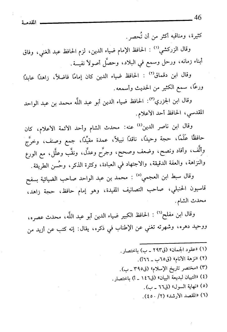 وقال ابن مفلح (¬6): الحافظ الكبير ضياء الدين أبو عبد الله، محدث عصره، ووحيد دهره، وشهرته تغني عن الإطناب في ذكره، يقال: إنه كتب عن أزيد من