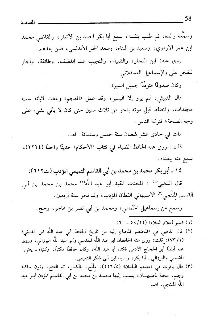 (¬2) قال الذهبي في "المختصر المحتاج إليه من تاريخ الحافظ أبي عبد الله ابن الدبيثي" (1/ 73): قلت: روى عنه الحافظان أبو عبد الله المقدسي وأبو عبد الله البرزالي، وروى عنه أيضًا أبو الحجاج الأدمي فكناه أبا عبد الله، وكان حافظًا مكثرًا، وكنياه- يعني: المقدسي والبرزالي- أبا بكر، ونسباه ابن أبي شكر التميمي.