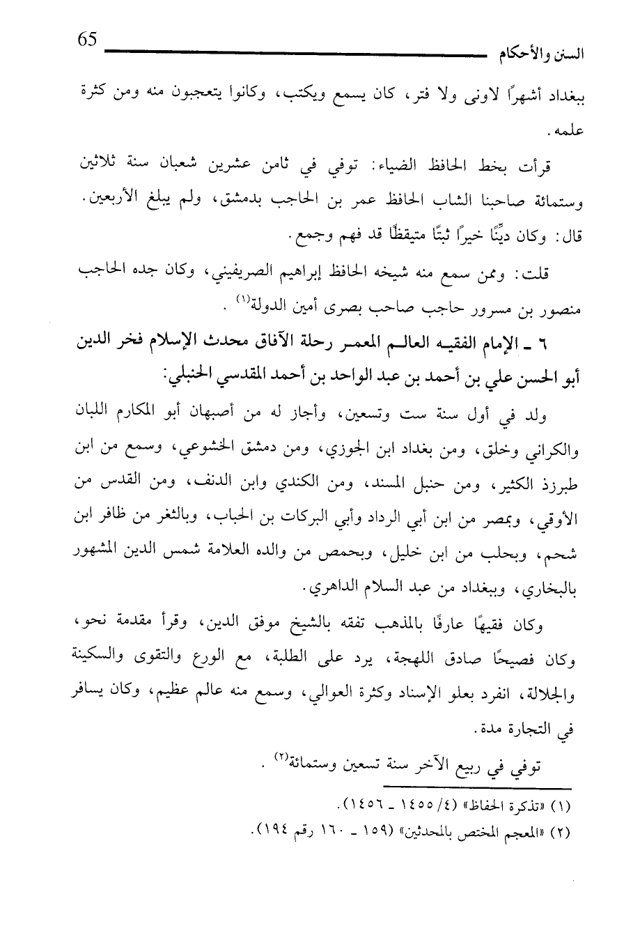 6 - الإمام الفقيه العالم المعمر رحلة الآفاق محدث الإسلام فخر الدين أبو الحسن علي بن أحمد بن عبد الواحد بن أحمد المقدسي الحنبلي: